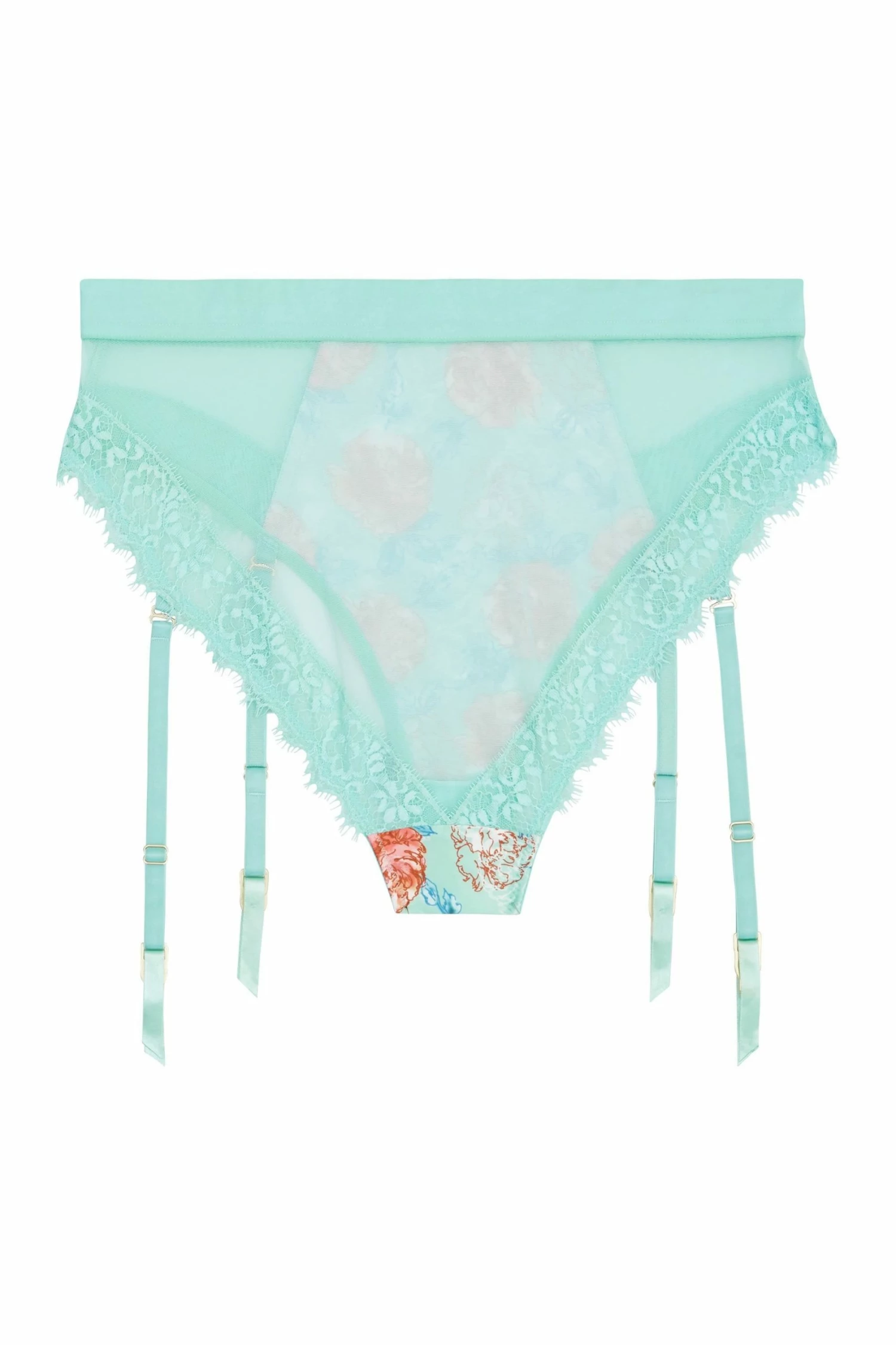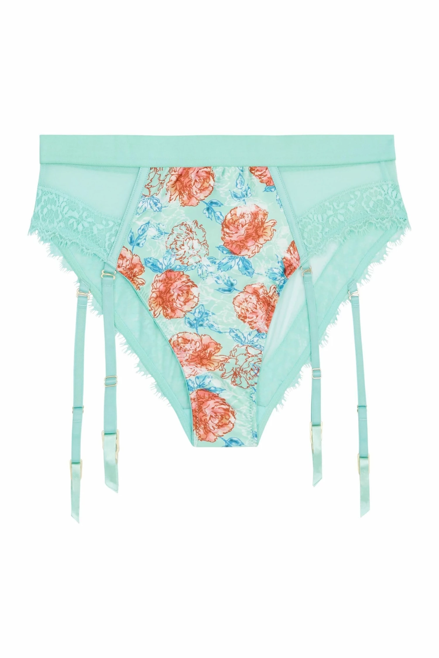 This refreshing retro floral set is perfect for getting a spring in your step! A mixture of watercolour and line-drawn florals are featured on the satin panels รยขรขโยฌรขโฌล a design that was made exclusively for this collection and designed in-house. Sheer mint mesh and lace adorn the trims, and four adjustable suspender straps are ready for stockings to be attached to.