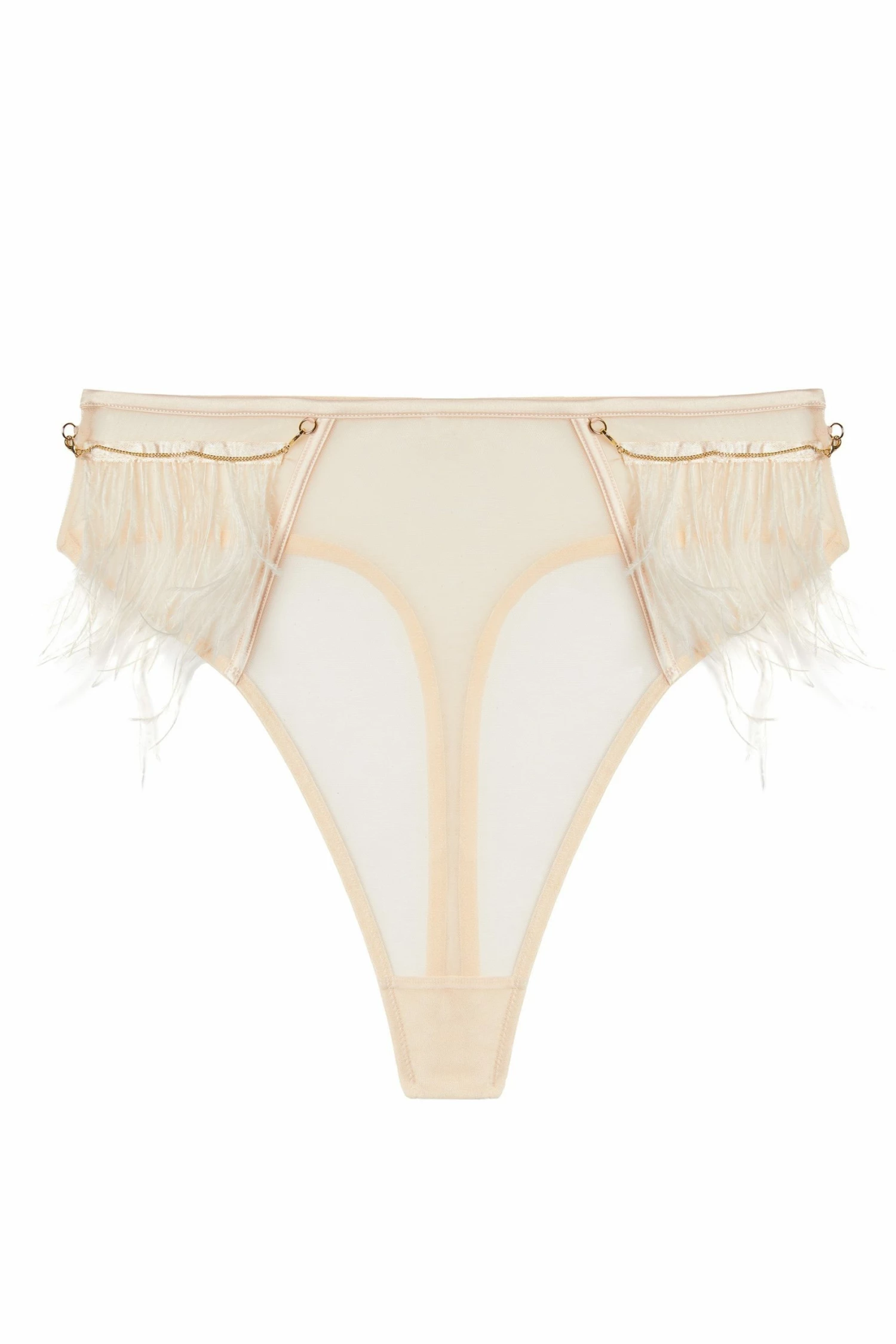 Feel lavish in our Phoenix Blush Brief, these high waisted briefs are constructed from sheer blush mesh and features detachable fluffy feather accents on the hips for added wow factor. For the complete look, pair with the matching Phoenix Bra.