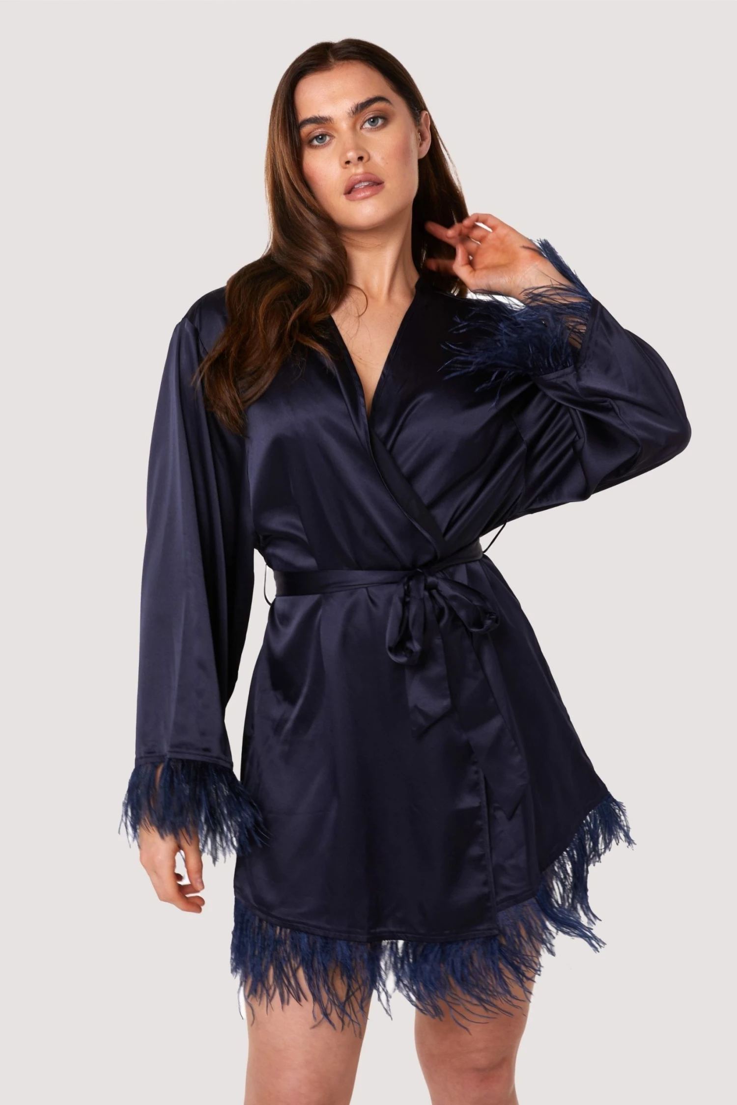 Feel Luxe in our Teal Feather Kimono. Made from ultra silky satin and finished with a fluffy feather trim on the sleeves and hem, this kimono is guaranteed to make you feel boujee.