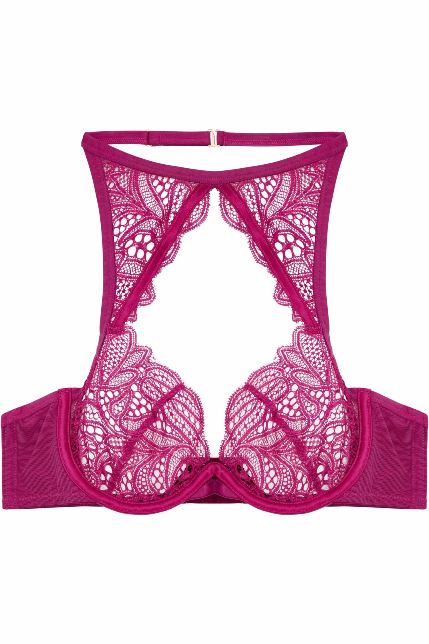 Pretty in pink. Claudia is fun and unique. The high neck style, features see through lace cups with no backing, elasticated strappy details front and back and if by magic no straps. The halter neckline is elasticated, with an easy clasp at the back and is fully adjustable.