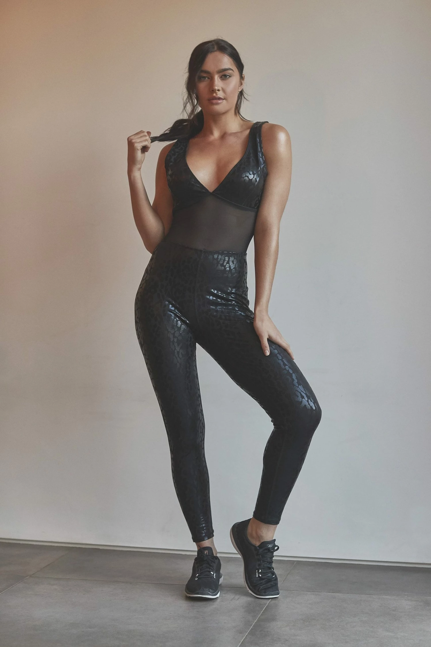 A wet look activewear jumpsuit. Work up a sweat in this glamorous catsuit with Black leopard foil print and an elasticated mesh waist.