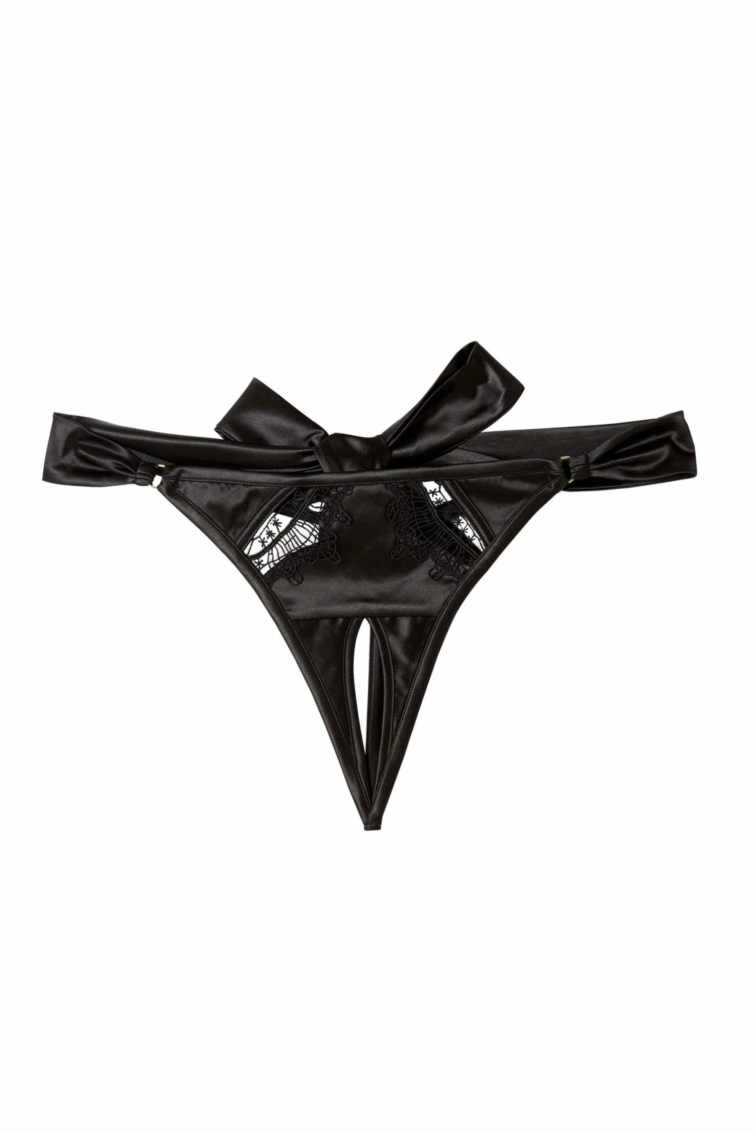 You are the gift in this power combination of satin and lace.. introducing the Wren Black Satin and Lace Ouvert Thong. This jaw dropping piece is contructed entirely of satin, with intricate lace detailing, a tie-up bow feature at the back, and an ouvert crotch that is sure to send hearts racing.