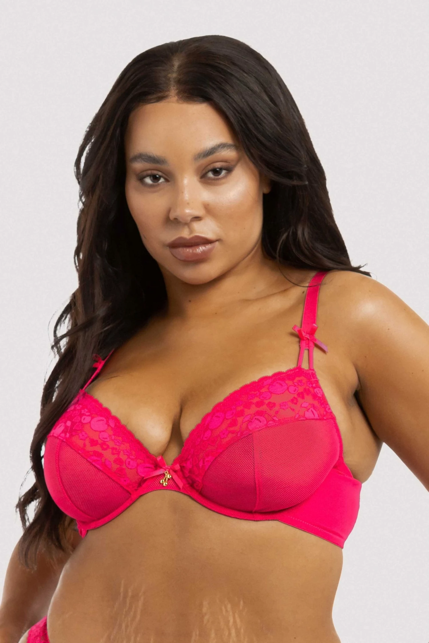 Be the cherry on top of the cake in our Jordan Bra….Made from hot pink mesh and cherry patterned lace this is the perfect cute but sexy bra for you. Finished with pink satin bows and a cherry charm in the centre. Match with our Jordan Brief and Suspender Belt for the full look.