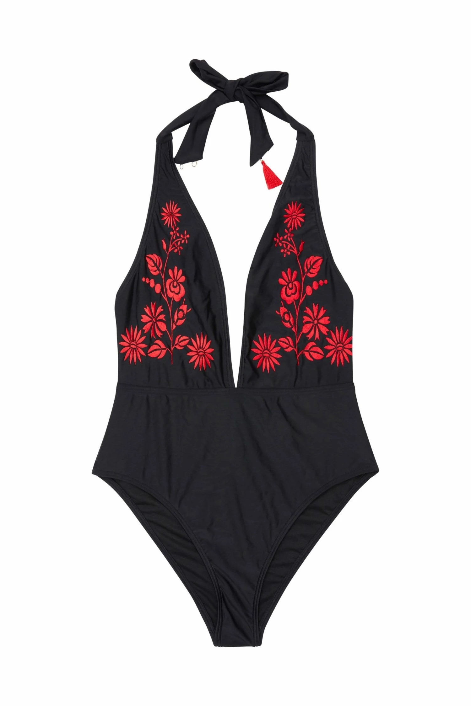 Bloom beachside in the Embroidered Floral tassle Swimsuit, with its delicate red embroidery over black.