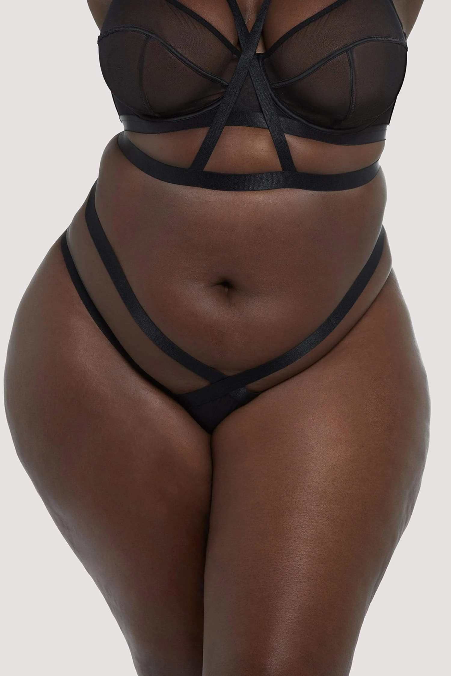 A step towards the dark side, this harness-laden set is bound to get hearts racing! Sheer black net is contrasted with black satin elastic straps that adorn the hips and waist. The sheer mesh shows a little peek of whatรขโฌโขs beneath!
