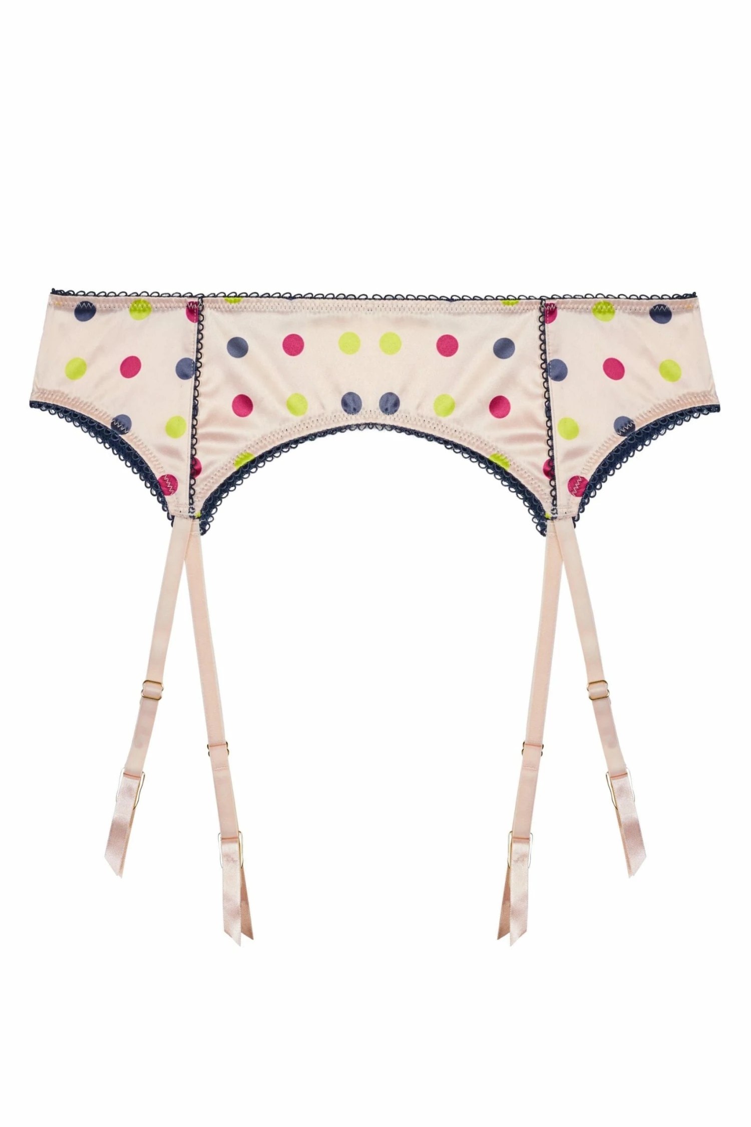 A spot of fun in this colourful pink suspender. The Rowswell features a multicoloured polka dot print with a delicately finished navy scalloped edge. Style with the matching bra and briefs to complete your look