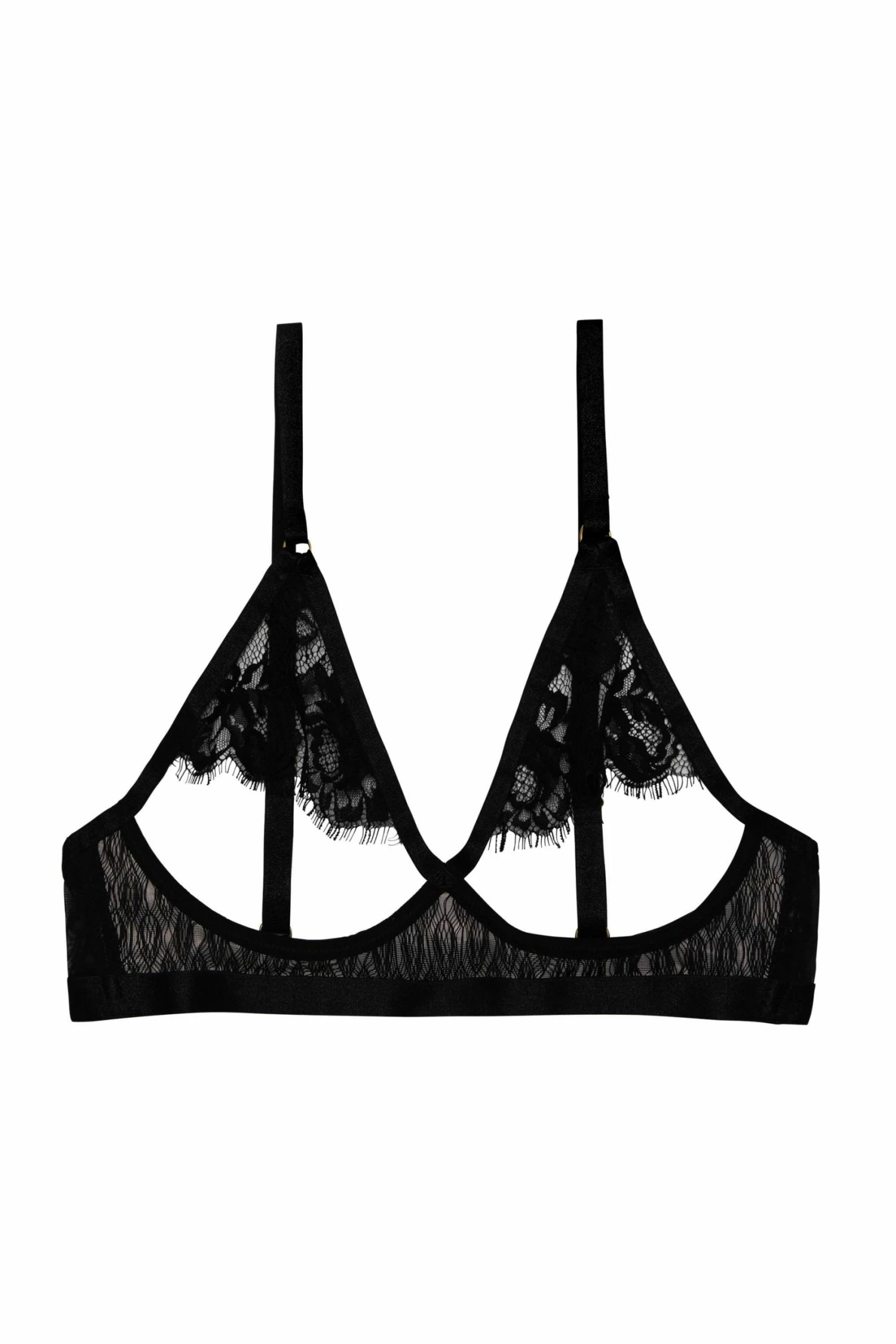 Feeling adventurous? The Blair open cup is for you! Totally cupless and revealing, this can be worn with pasties or nothing at all. It features geometrical lace on the band, and eyelash lace adorning the harness straps.