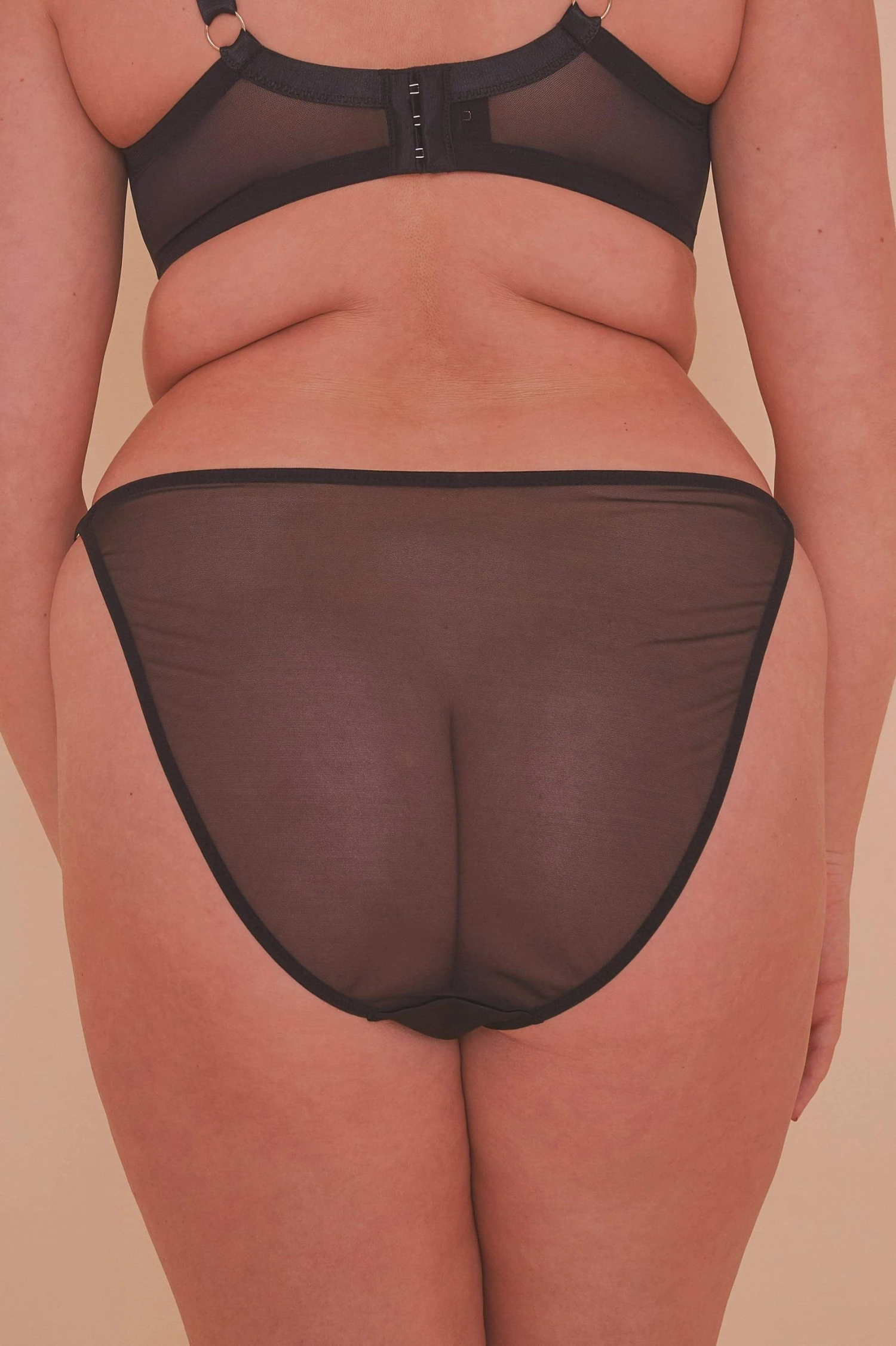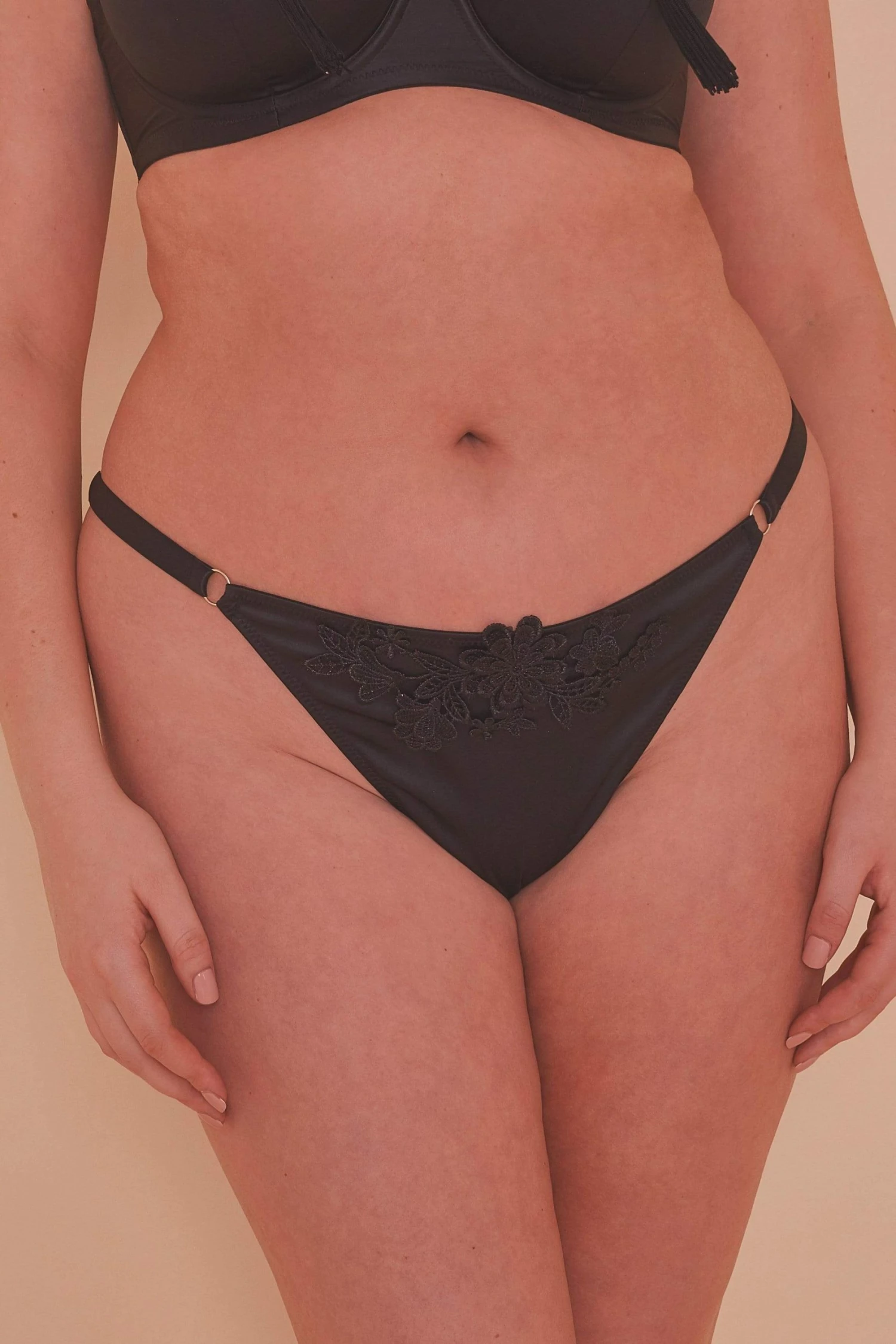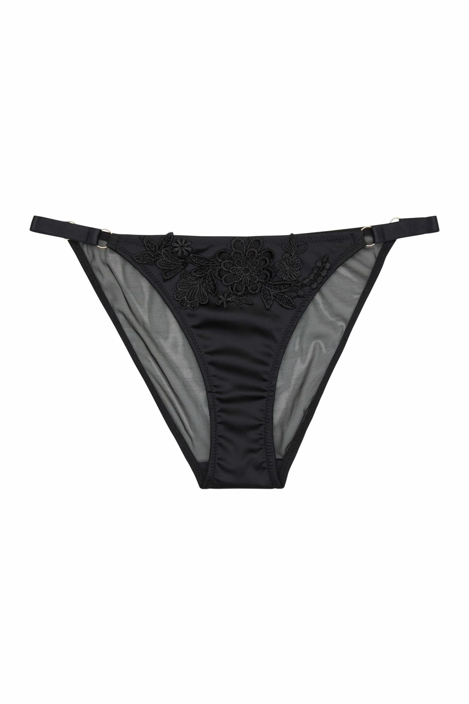Exude elegant sensuality in the Guipure Tanga. Black satin is embellished with applique lace on the front of the brief, with a sheer mesh back.