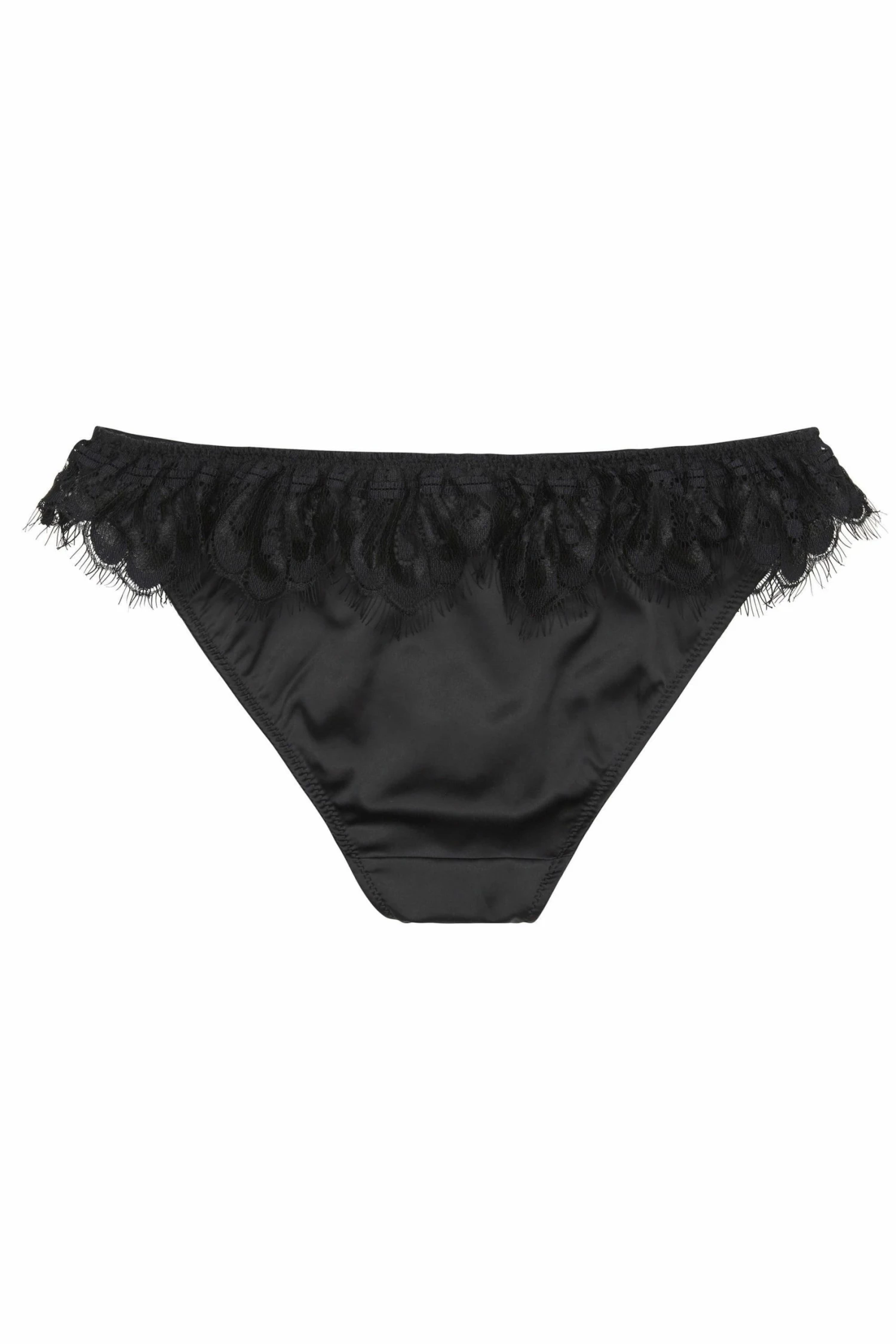 In a classic black satin, the Marlene Brief features a skirted eyelash fan lace around the hips for a flirtatious effect. Either side, two little black bows and wine red roses are an added detail to this pretty set!