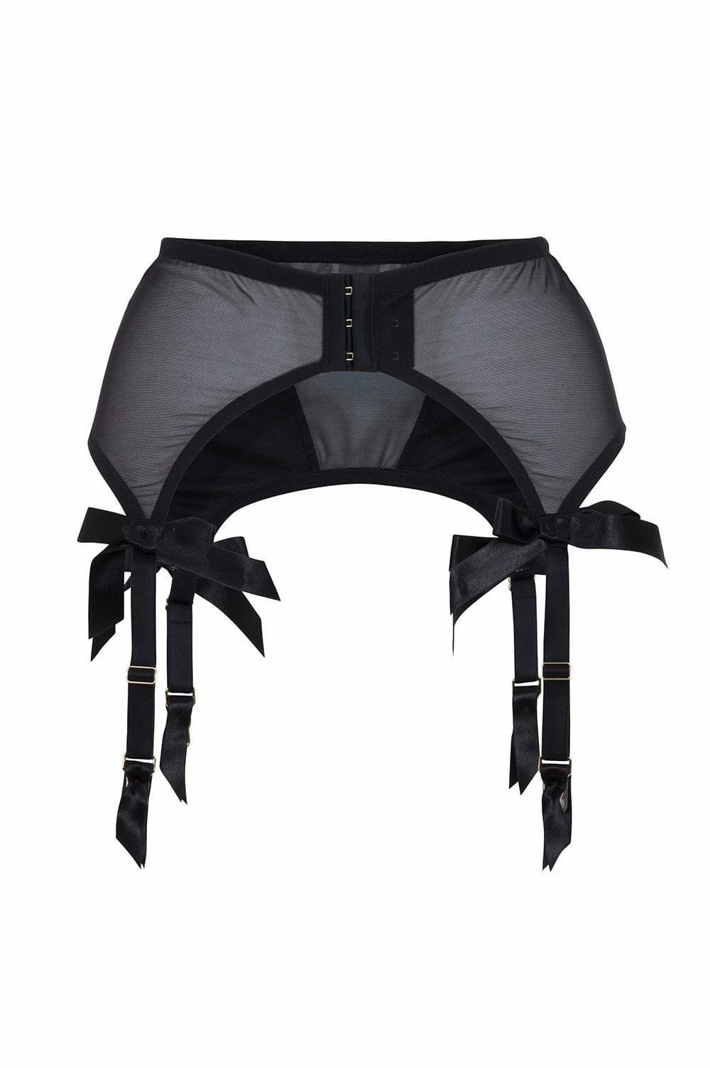 The perfect paring to either the Bullet Bra or the Overwire Bra, this suspender belt has a v-shaped sheer mesh panel in the centre, accompanied by two satin panels adorned with contrast zig-zag stitching. Pretty bows embellish the tops of each suspender strap, of which there are four to keep your nylons in place!