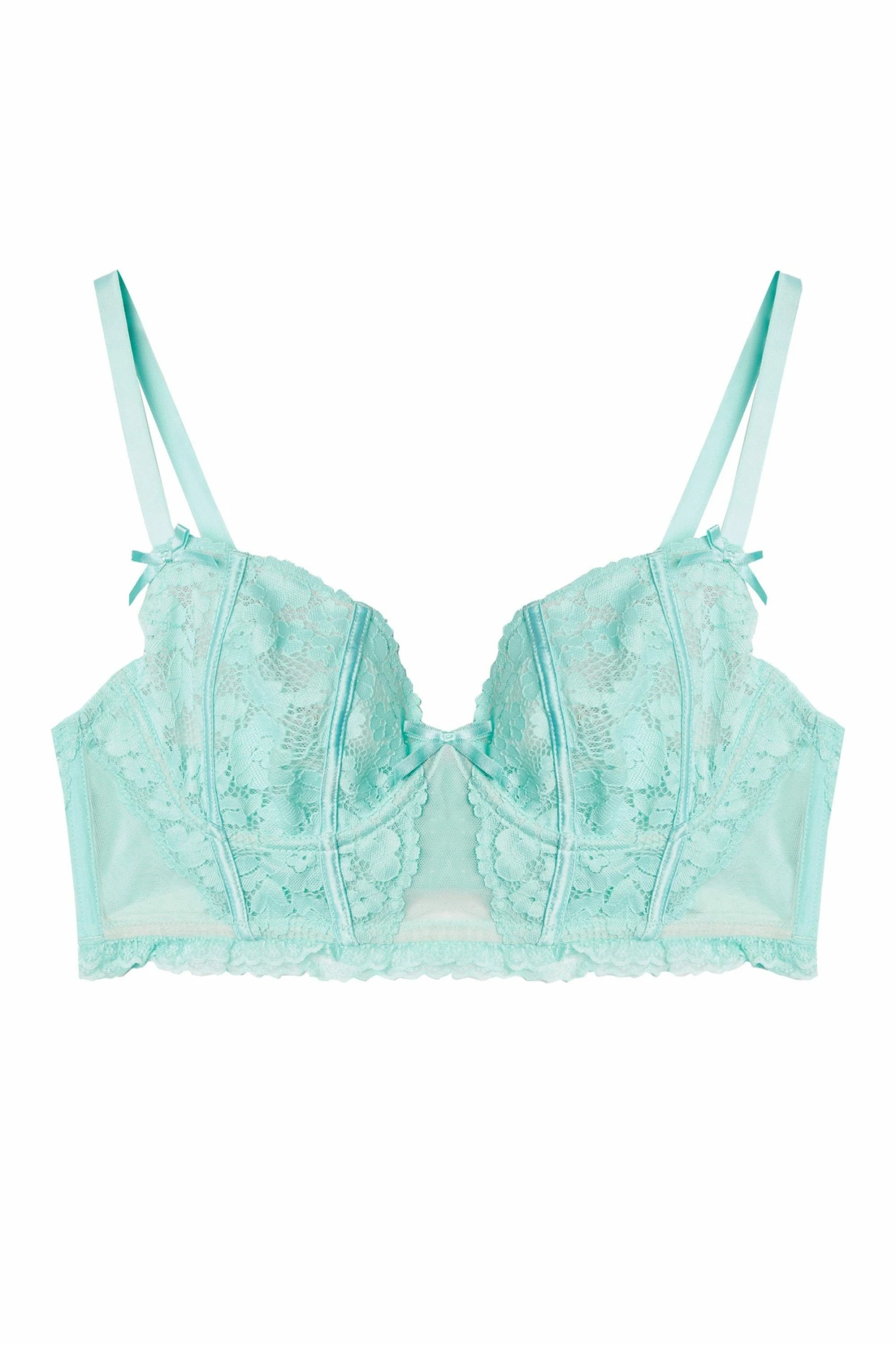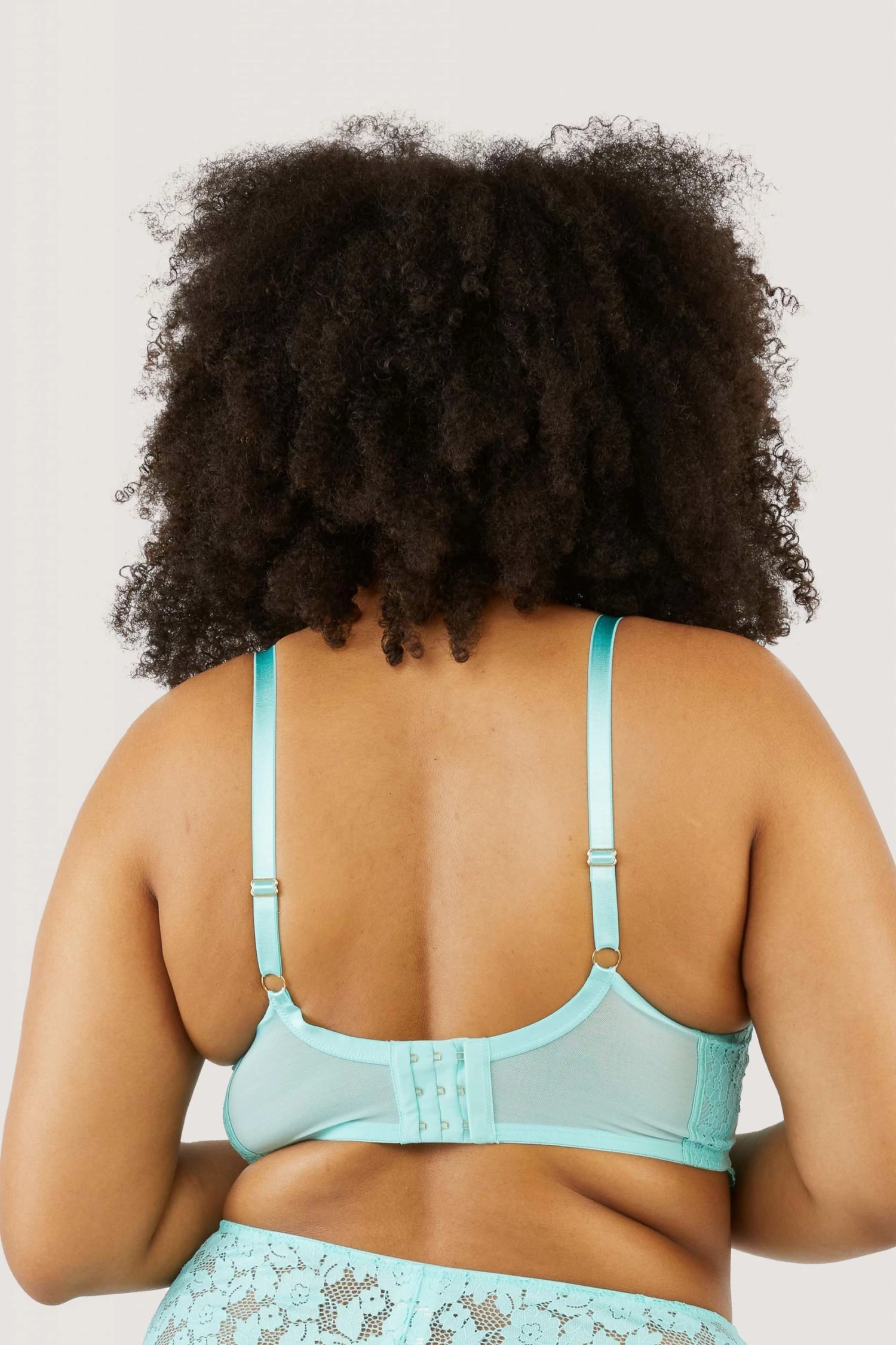Introducing another exciting collaboration with UK model and body positive activist, Felicity Hayward! A frilly lace dream. This mermaid aqua coloured longline bra features stunning lace and gorgeous satin piping. Pair with one of the matching open back briefs for a jaw dropping look.ย