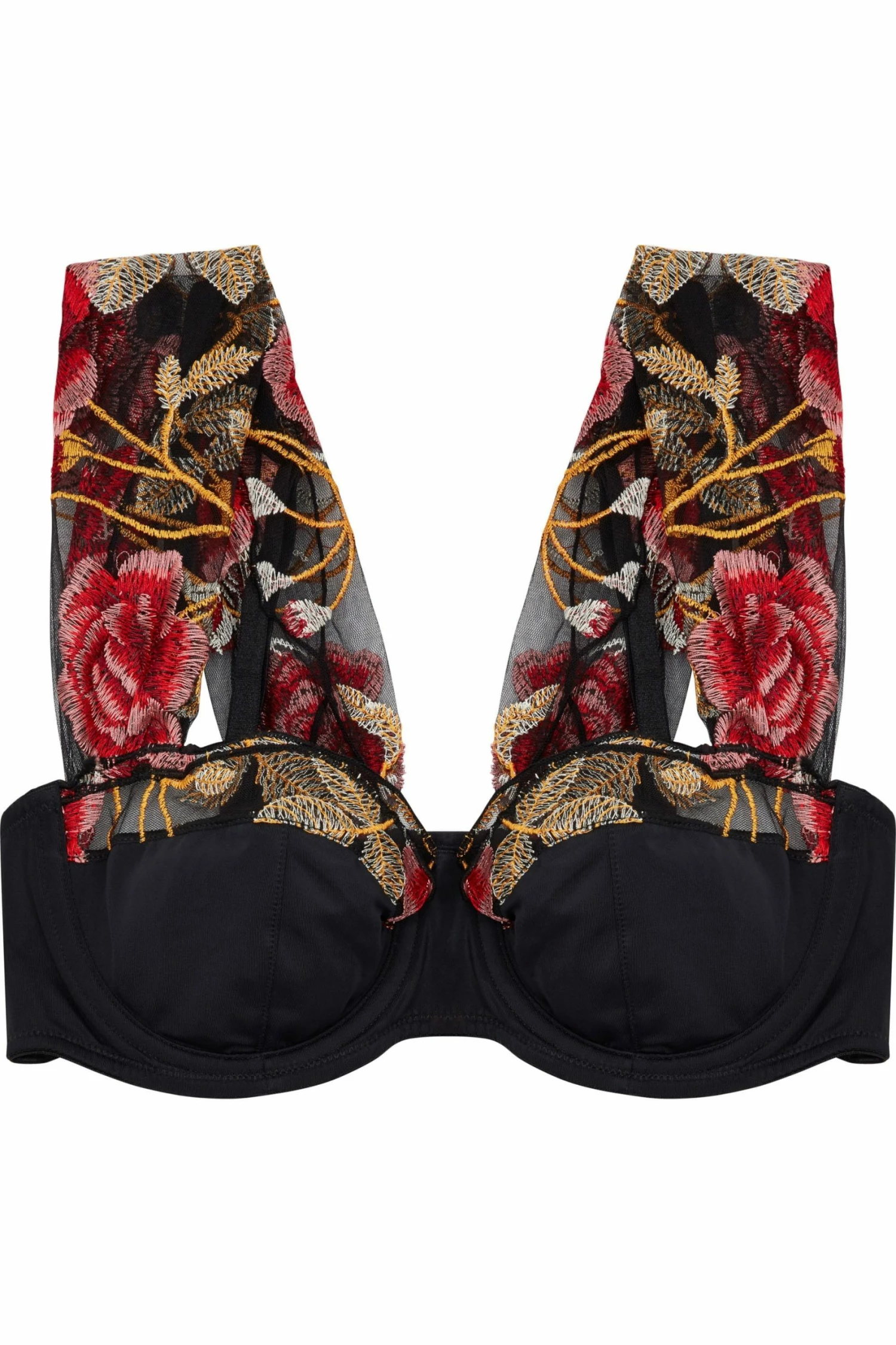 - Embroidered mesh edged the cups on a double layer, that then flows to create a bardot sleeve.