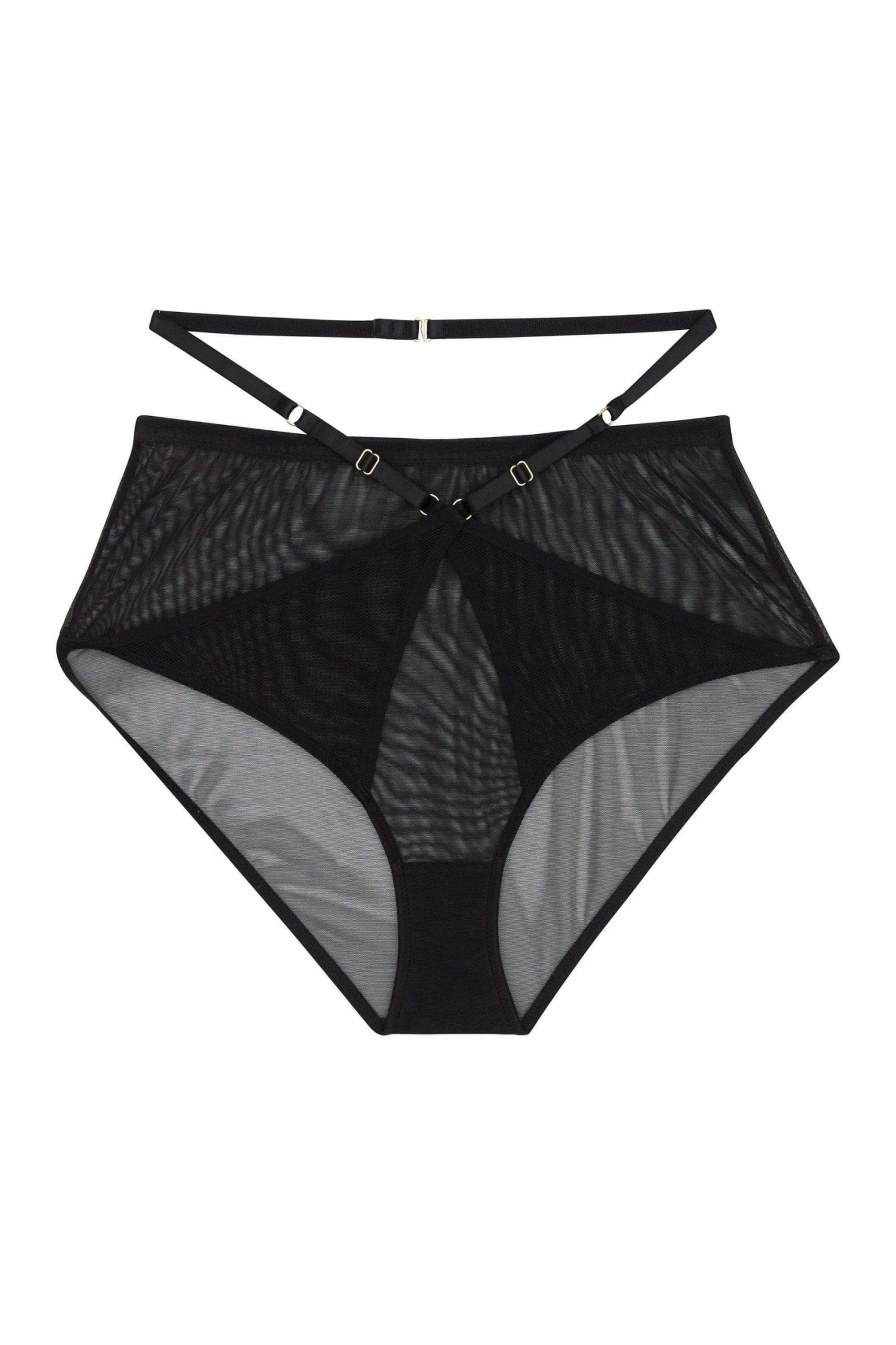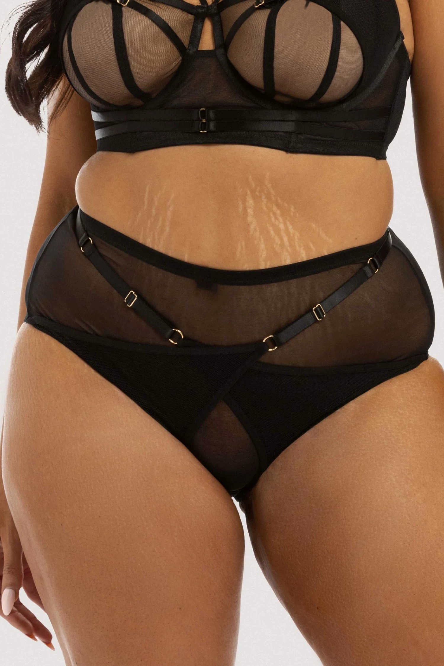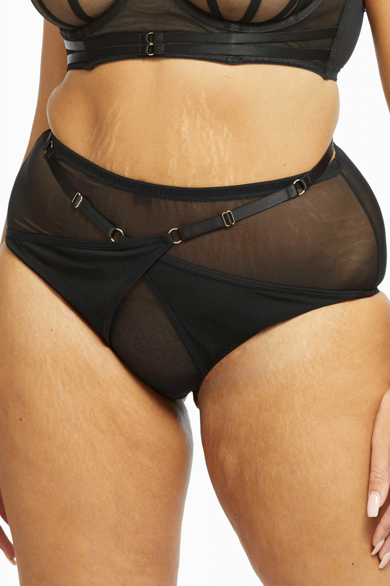 This ultra-strappy number is bound to get hearts racing! Featuring classic black mesh with fishnet crossover panels, and satin elastic harness detail. The waist strap is adjustable so you get the ideal fit