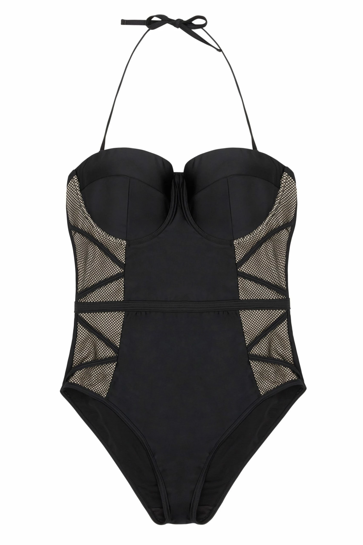 Channel your inner vamp in this curvaceous number! The swimsuit features full coverage cups and panels in classic black along front panel and back, and is further adorned with wide net fabric covering caramel-coloured mesh base. The swimsuit features a criss-cross strap detail along the sides, and removable ties behind the neck.