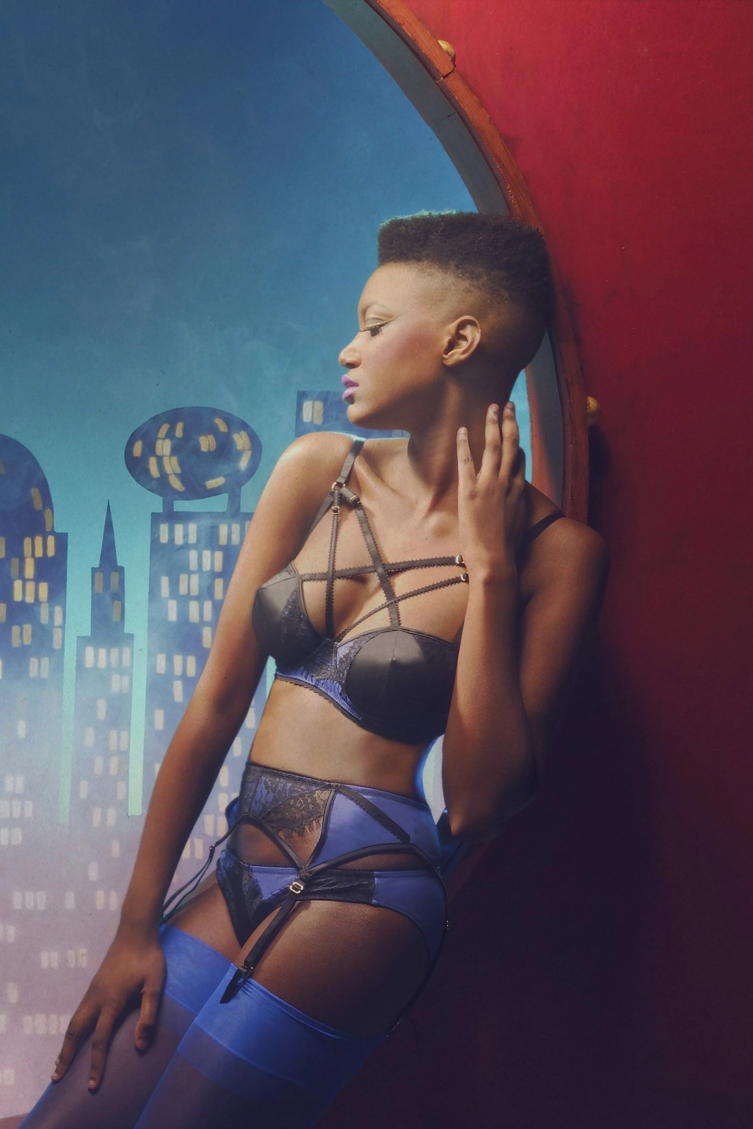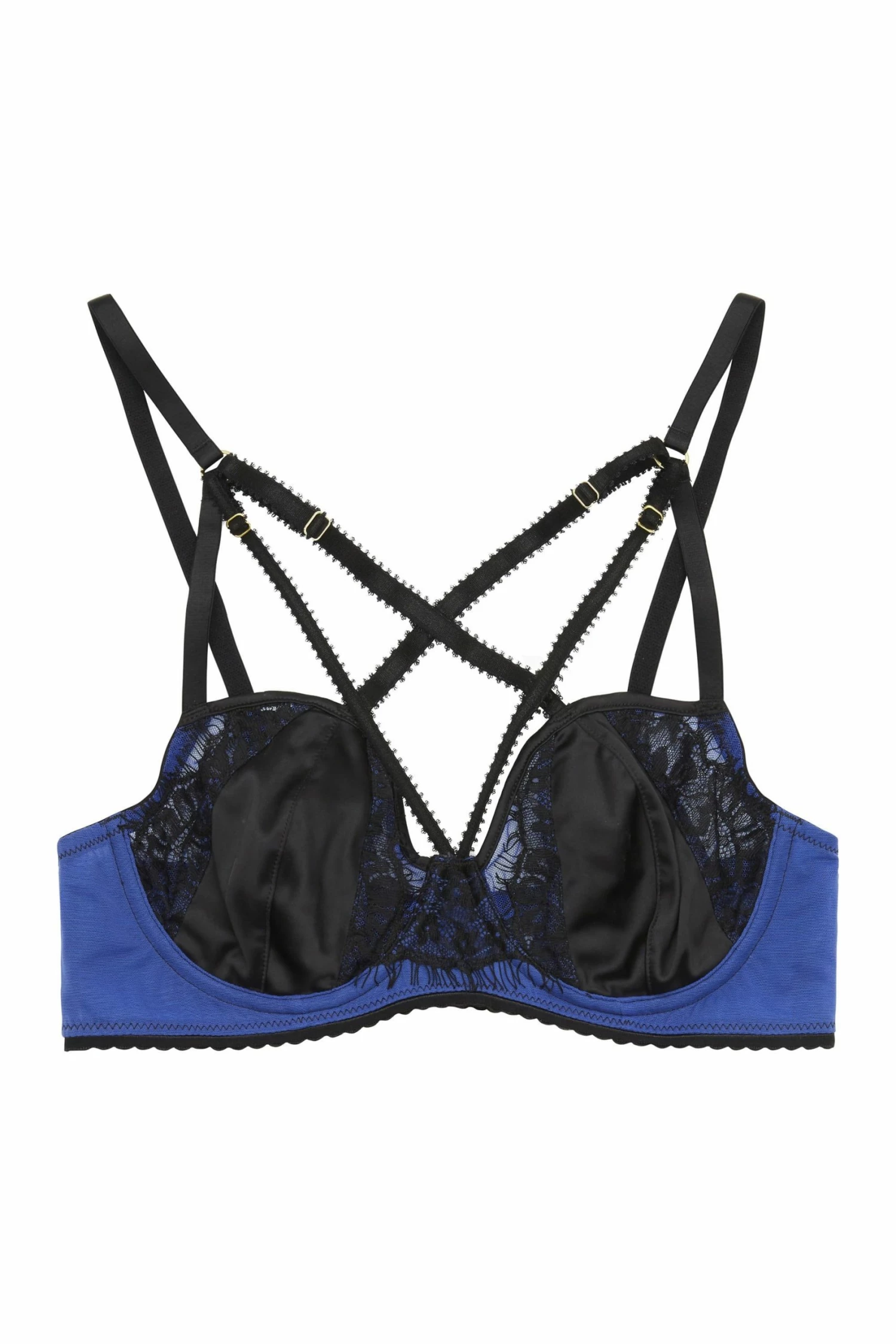 Indigo is a cute and playful addition to anyone’s lingerie drawer! The bra features beautiful black satin outlined by floral lace layered over bright indigo blue mesh A adjustable cross over harness detailing stands out, attached to the straps with o-rings.