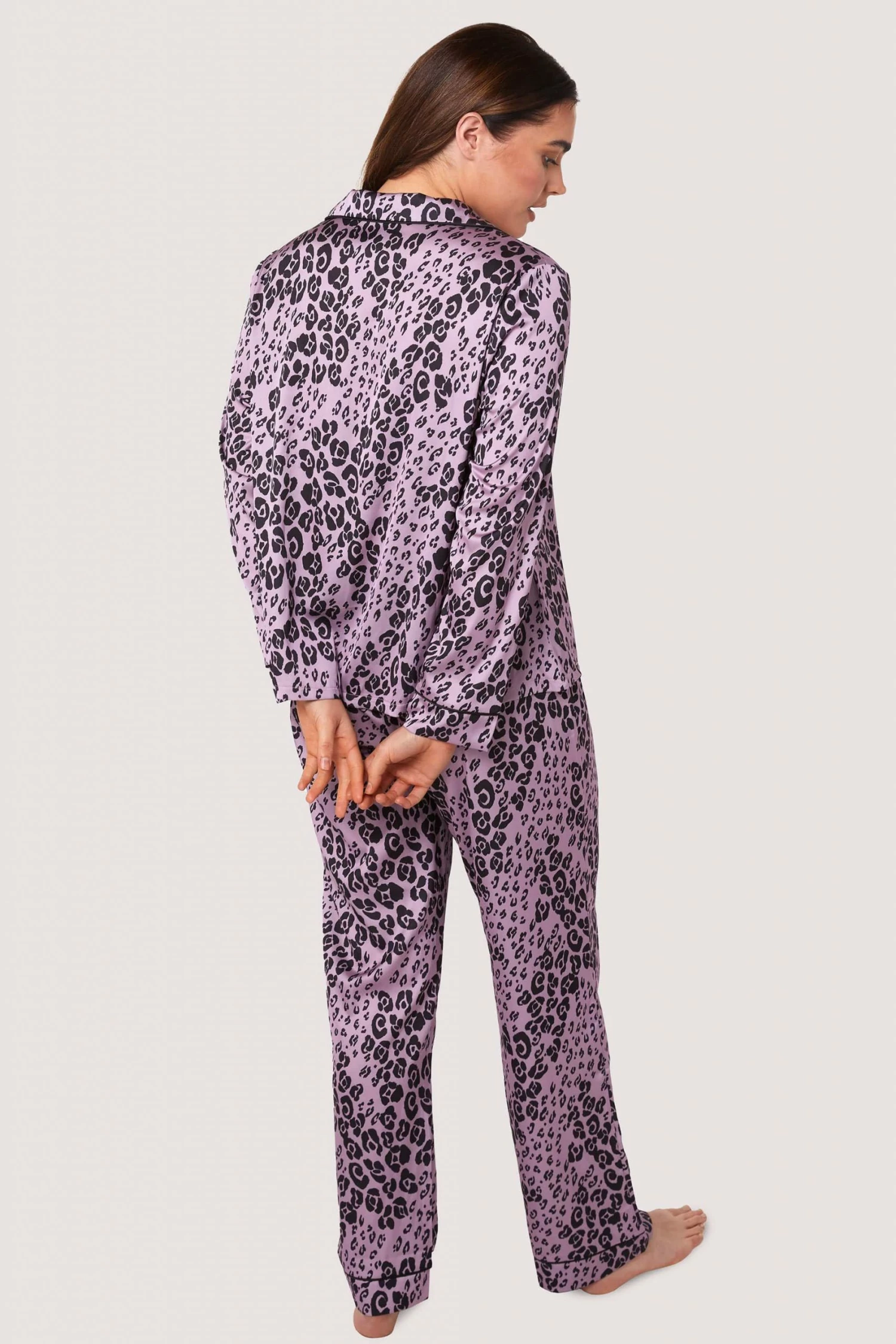 Cozy up in our Lilac Animal Print Satin Pyjama Set. This PJ set is designed in ultra soft lilac satin with a powerful animal print detailing. This is the perfect set to relax and unwind in.