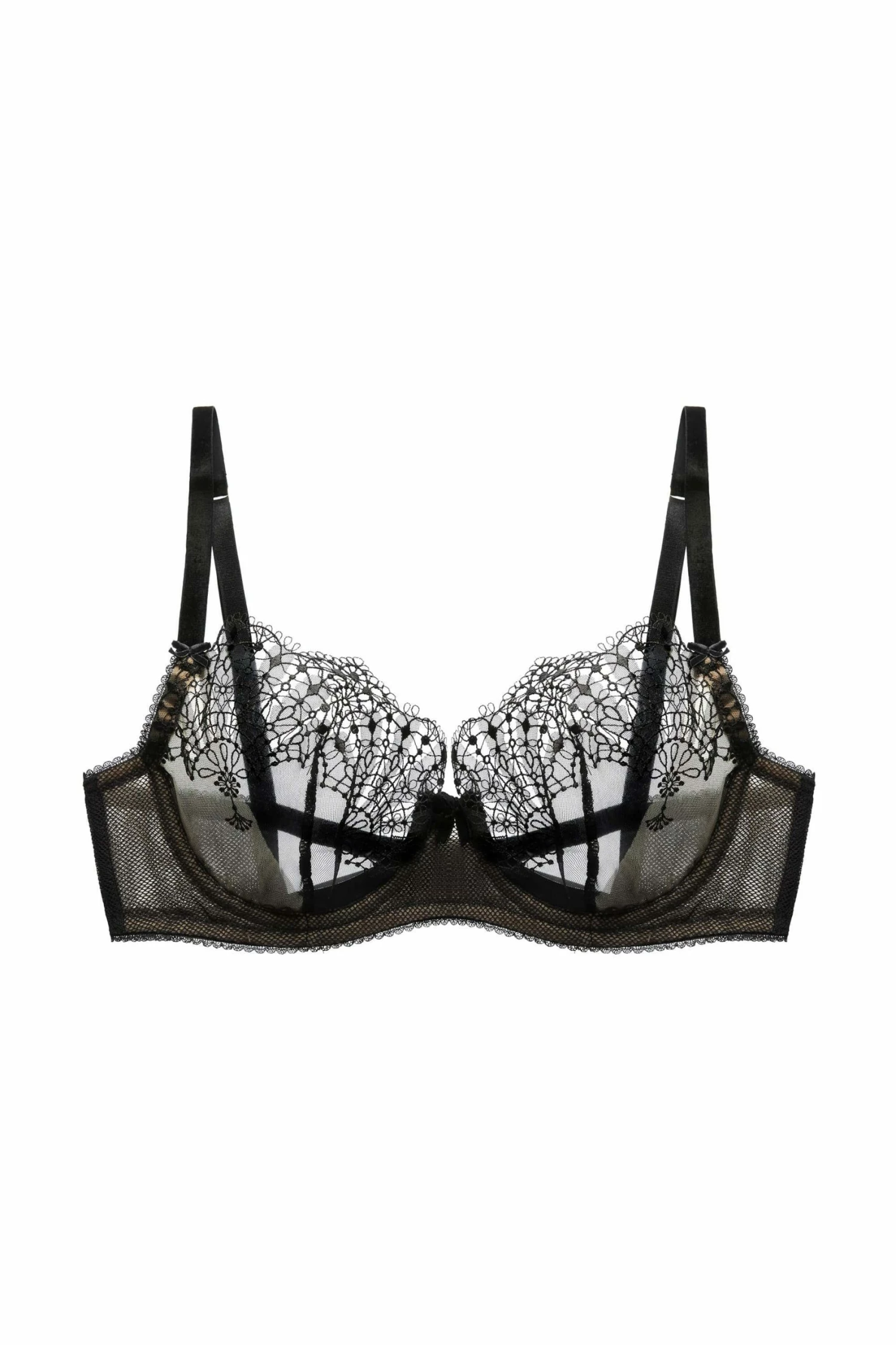 Fantastique is inspired by the beautiful fans Dita uses in her burlesque show. The fan embroidery is woven into the finest of tulle and laser cut for precise detail and combined with soft stretch fishnet mesh. The Fantastique bra is a sheer underwired bra with velvet straps and velvet bow trims.