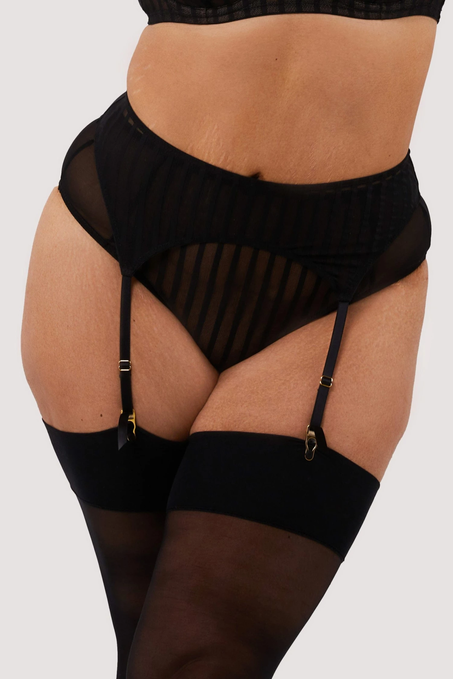 Get Passionate in Presley. This Black Suspender Belt is constructed of mesh with a stripe overlay. This will perfectly hug your curves, it also has a cheeky sheer mesh back. Pair with your favourite stockings and Presley Bra and Brief for the full look.