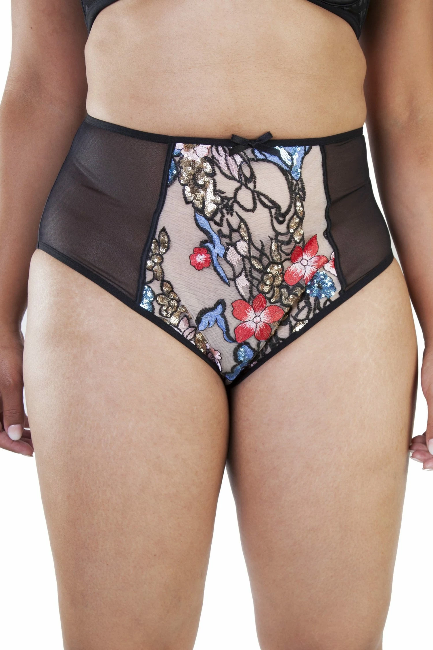 Nothing says fun like our sparkly Sequin High-Waist brief! The brief is adorned with a gorgeous floral and sequin cream lace panel at the centre and strong black mesh at the sides and back to hug and smooth your curves.