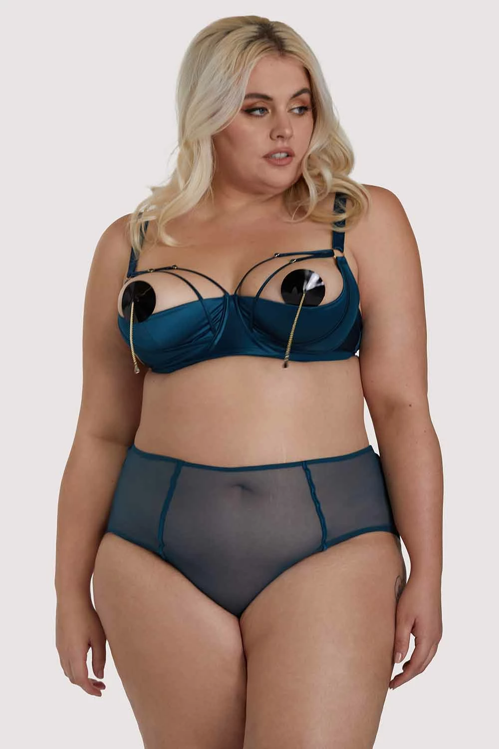 Treat your chest in the Firenza teal bra. With cut out panels showing a seductive slither of flesh underneath harness-style strapping, it’s a sure hit for date night.