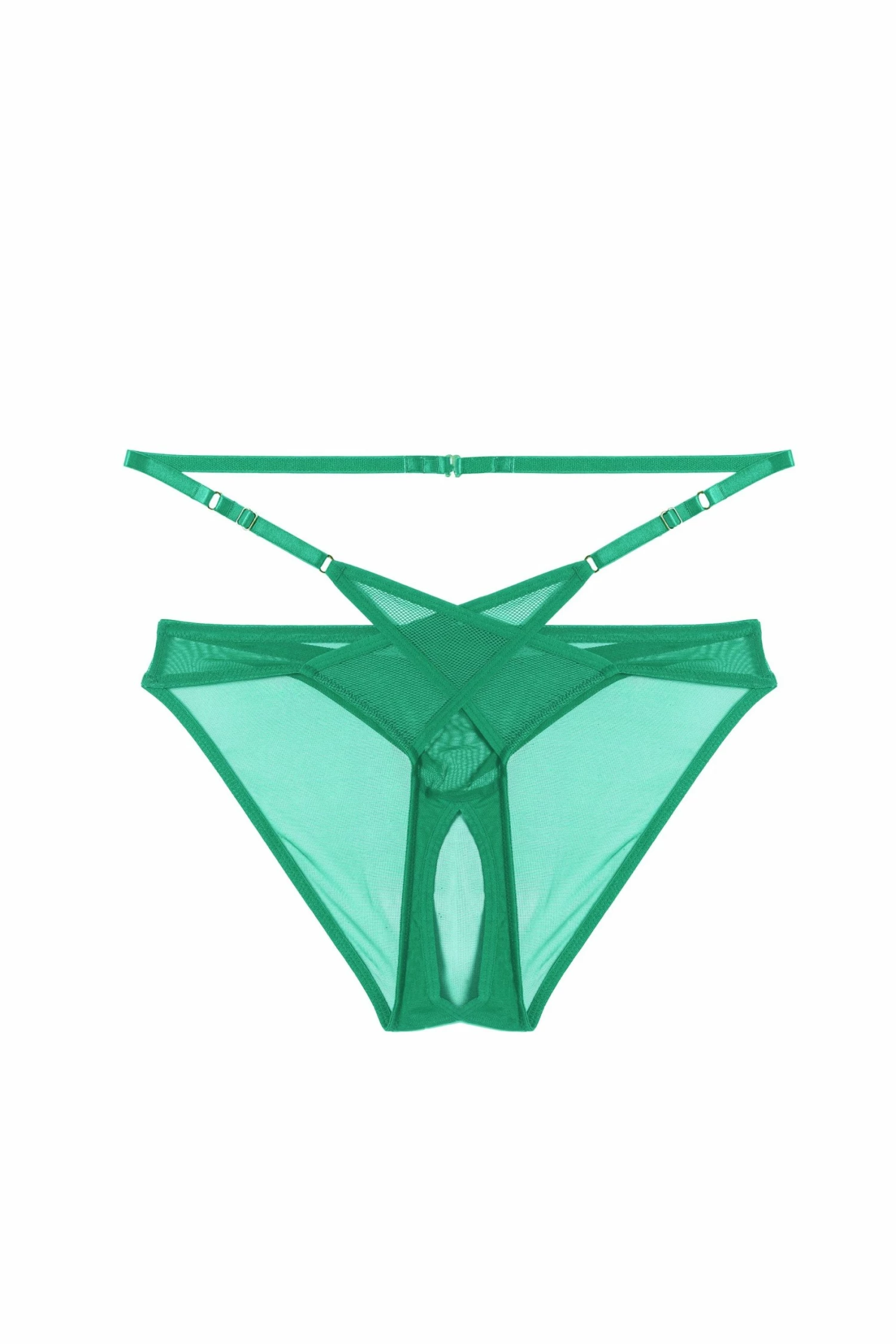 This ultra-strappy number is bound to get hearts racing! Featuring a forest green mesh with fishnet crossover panels, and satin elastic harness detail. The waist strap is adjustable so you get the ideal fit. The bold piece also features a crotchless gusset. Complete the look with the matching bra.