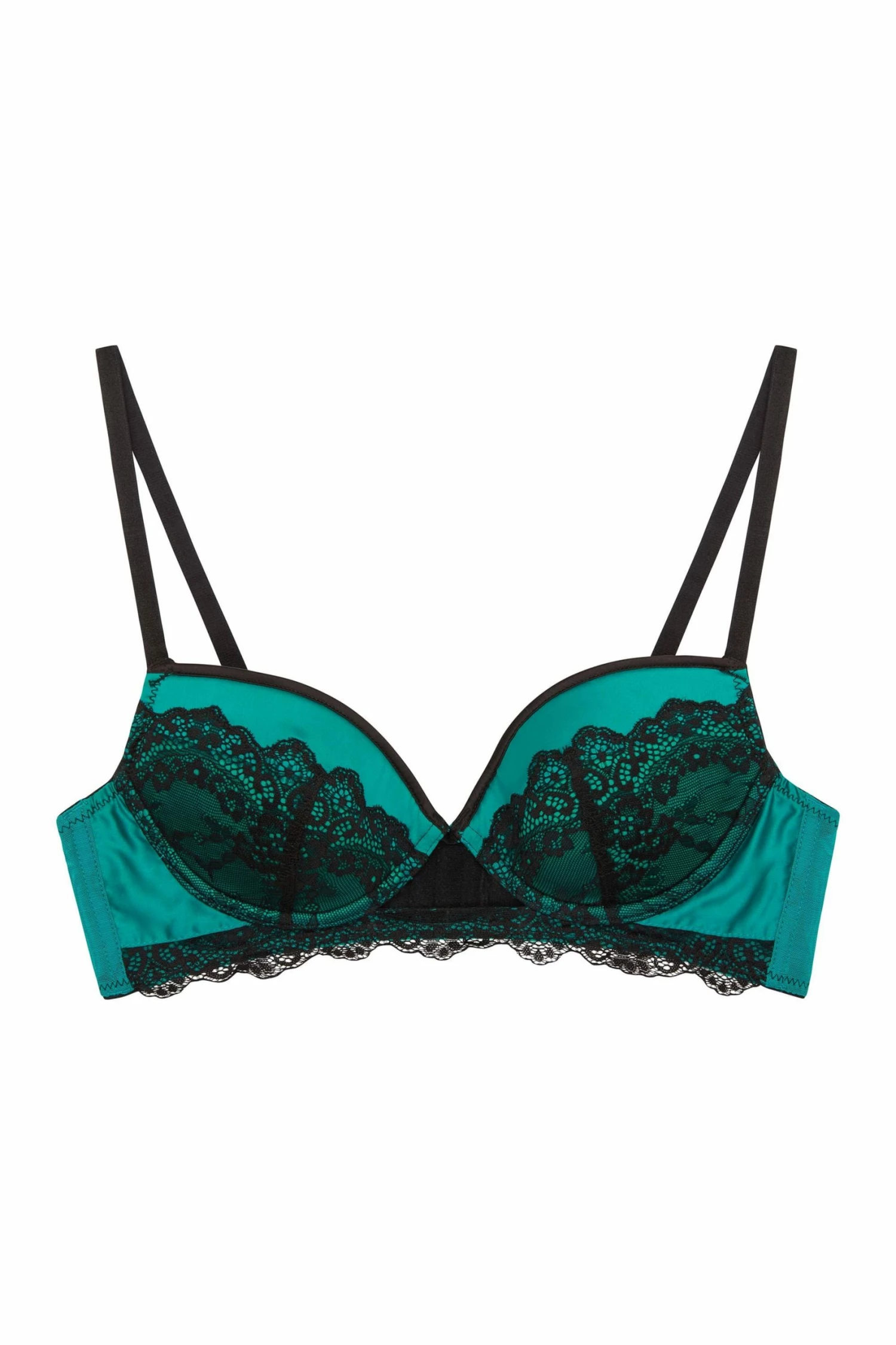 Kate is anything but innocent. The bright teal blue satin contrasts with the black lace that adorns each cup. A cut out in the middle gives a cheeky glimpse of skin.