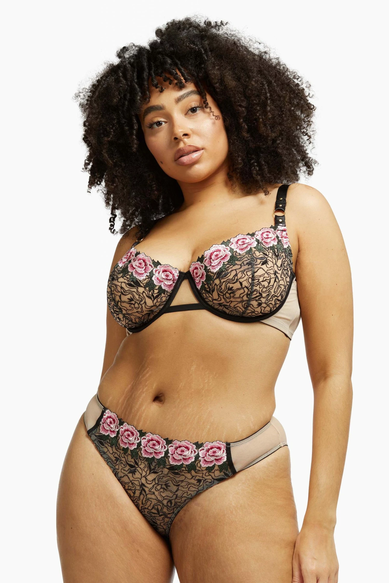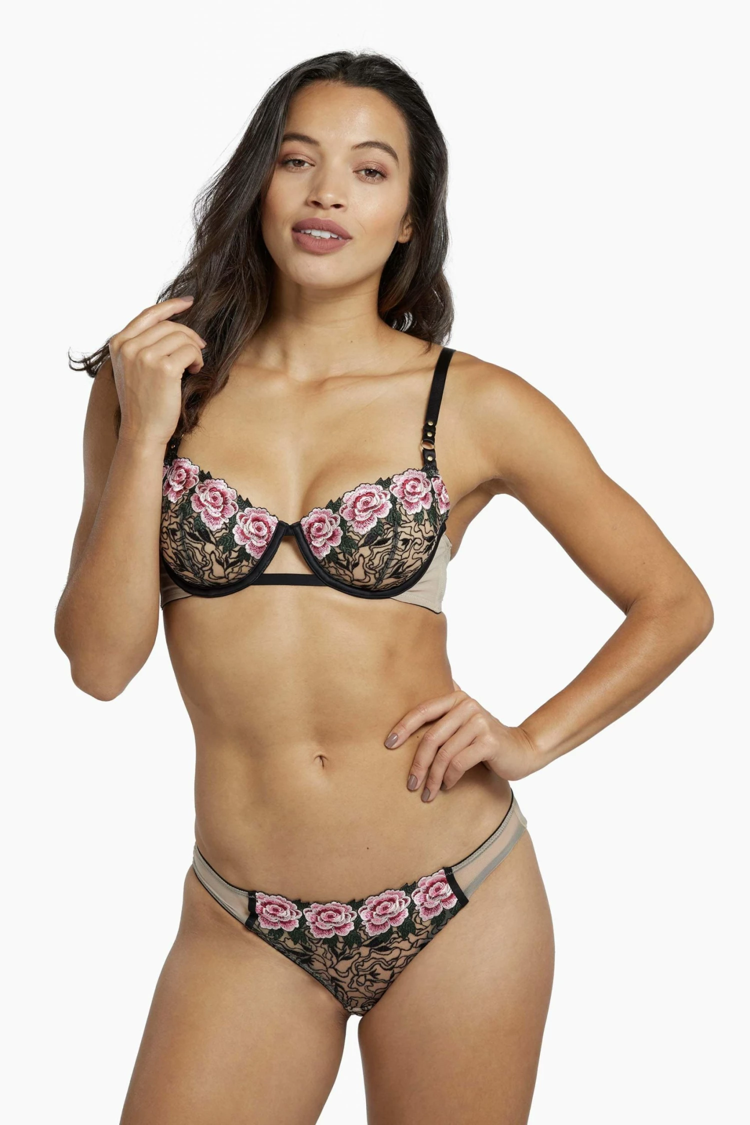 Find yourself in a floral wonderland in the Katy set! Pink roses are embroidered over a cream-coloured mesh, with abstract black embroidery over the cups. The straps are finished in sleek black satin to bring a modern look to this otherwise classically feminine set.