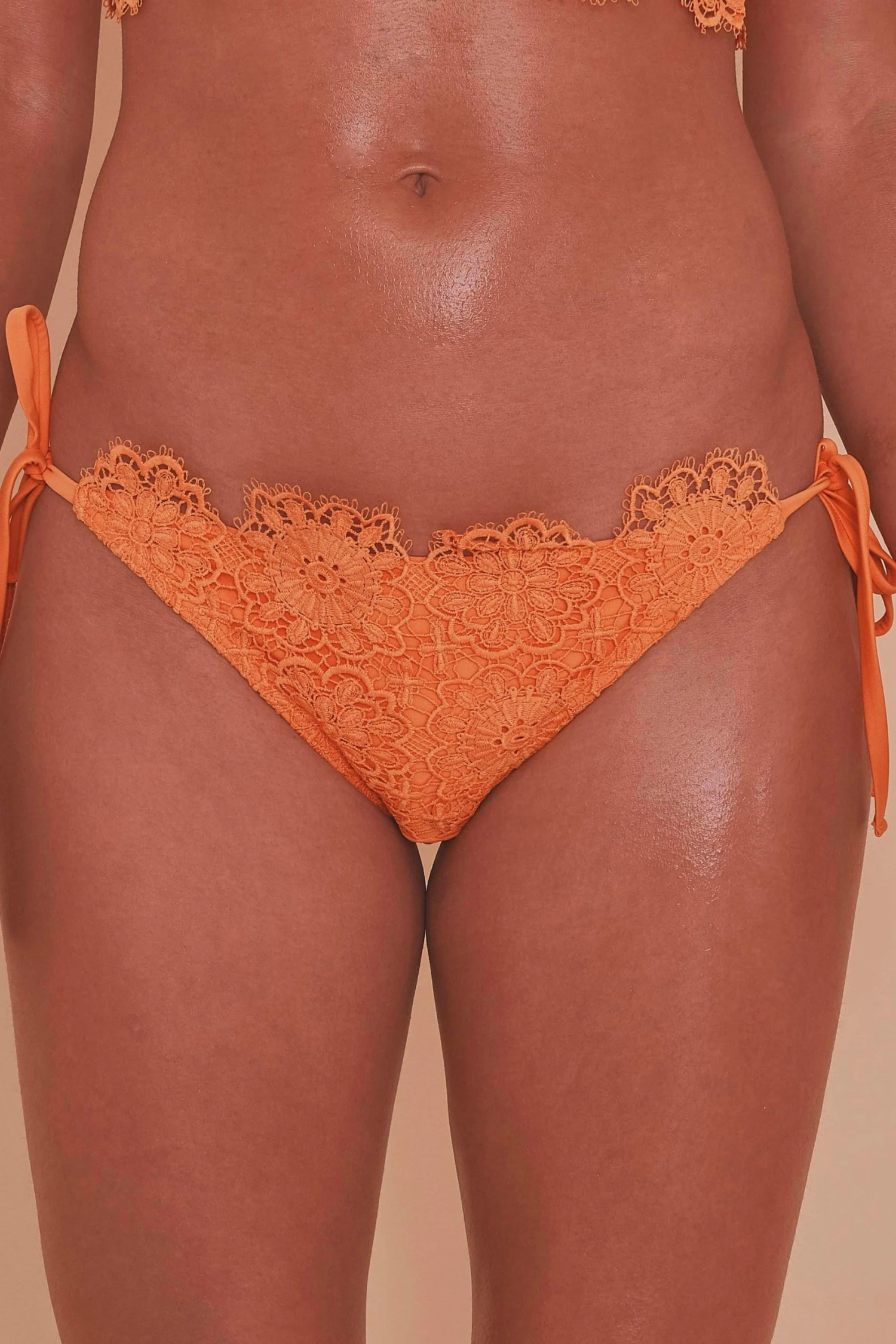 Elegance is bliss, in this one-off bright orange crochet bikini tie side brief. Adorned with crochet flowers on the front panel, what better way to flaunt your beauty.