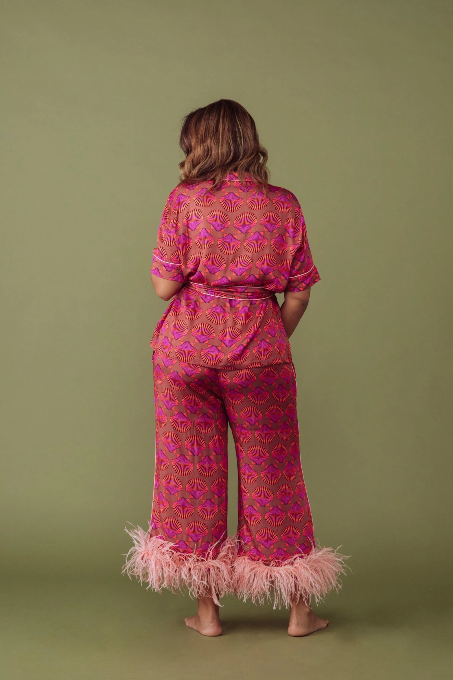 Embody elegance, comfort and style in this Kilo Brava nightwear set. Combining a gorgeous shell print and pink feather detailย creating a dynamic, textured look. What’s not to love?ย