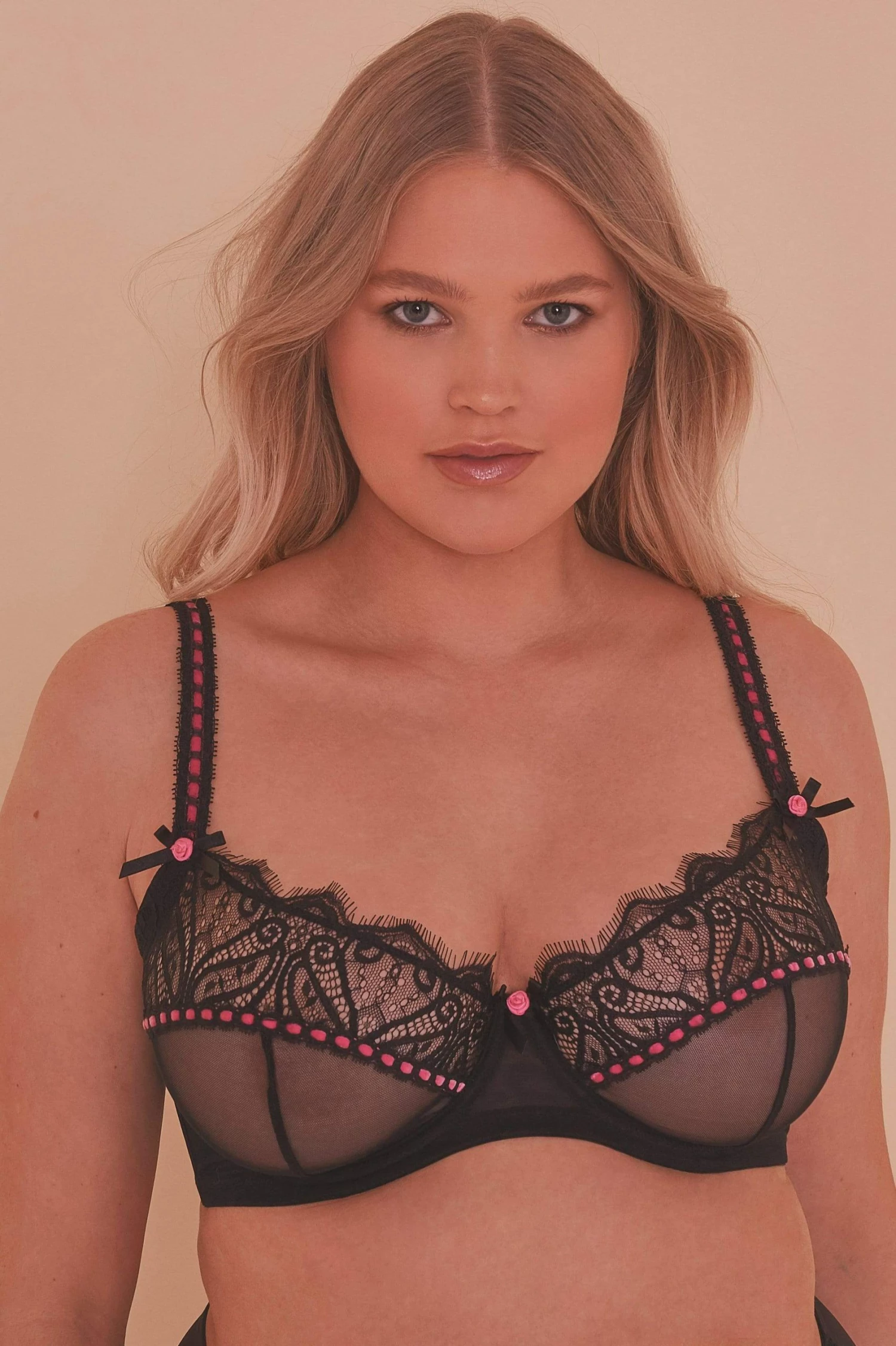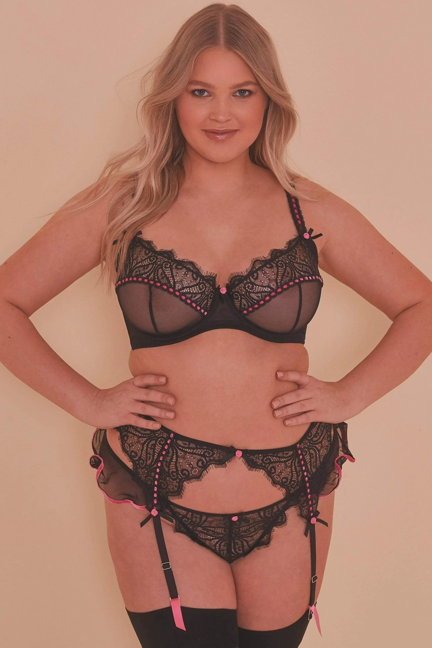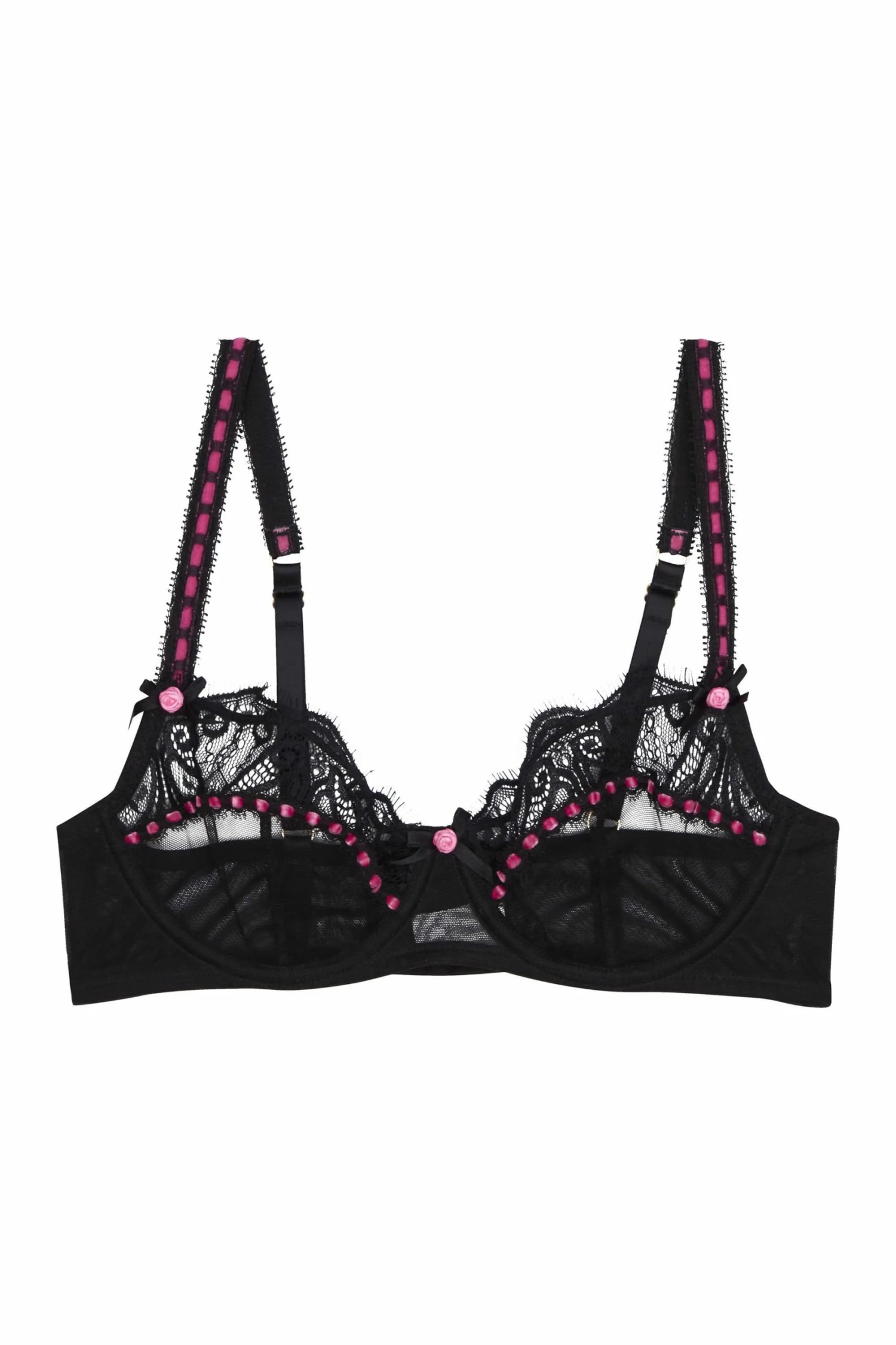 Meet your new lingerie-drawer staple! The Ribbon Slot set is a classic with it’s eyelash lace detail, mesh cups and hot pink ribbon slot detail. Each strap is finished off with a perfect rose and bow embellishment.