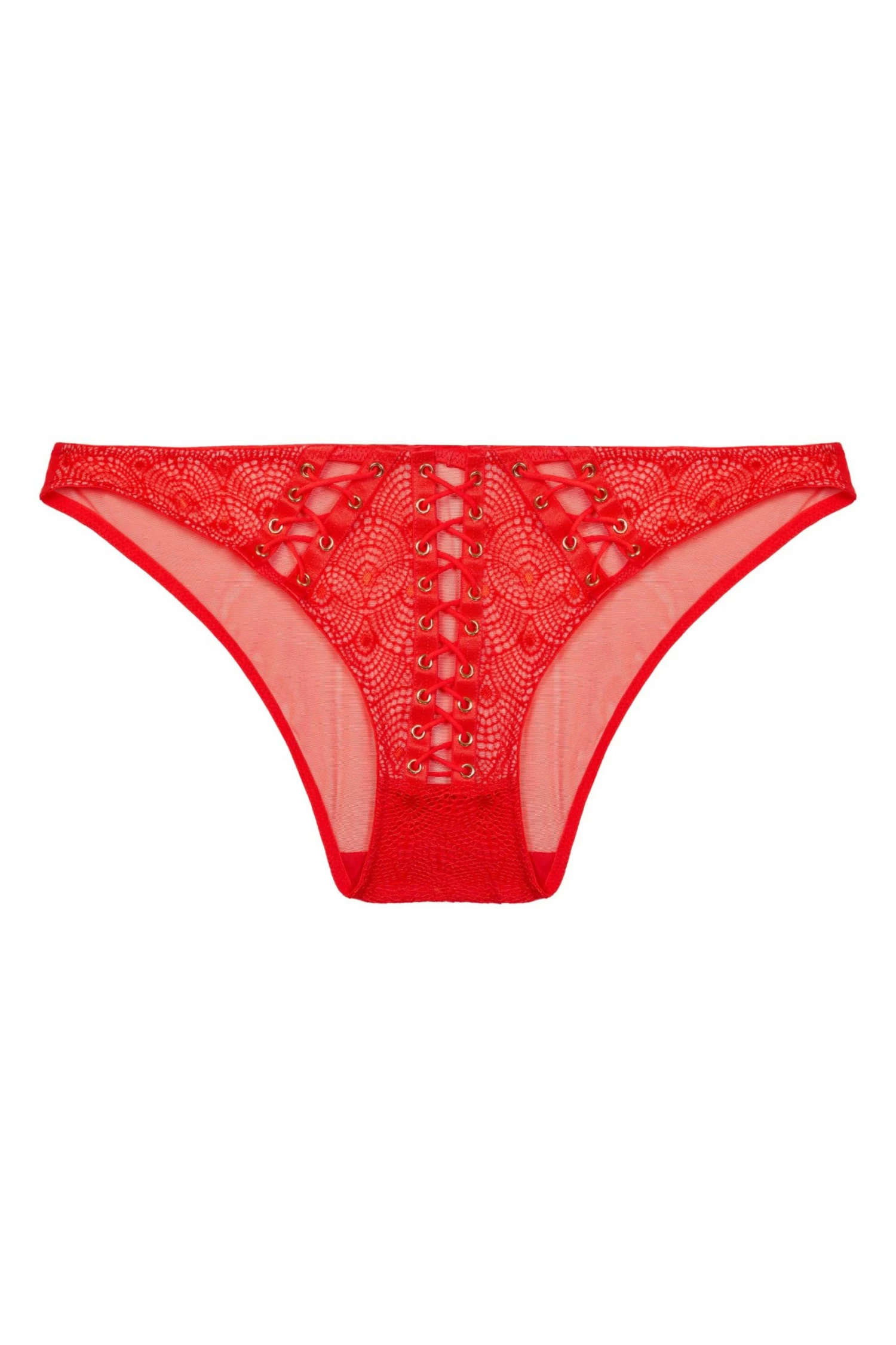 Lace-up your lingerie! The Florence set is for steamy nights. Geometric, circular lace is featured all over, which contrasts with the lace up detail on the front of the brief. The laces are made up from elastic string, perfect for getting your dream look.