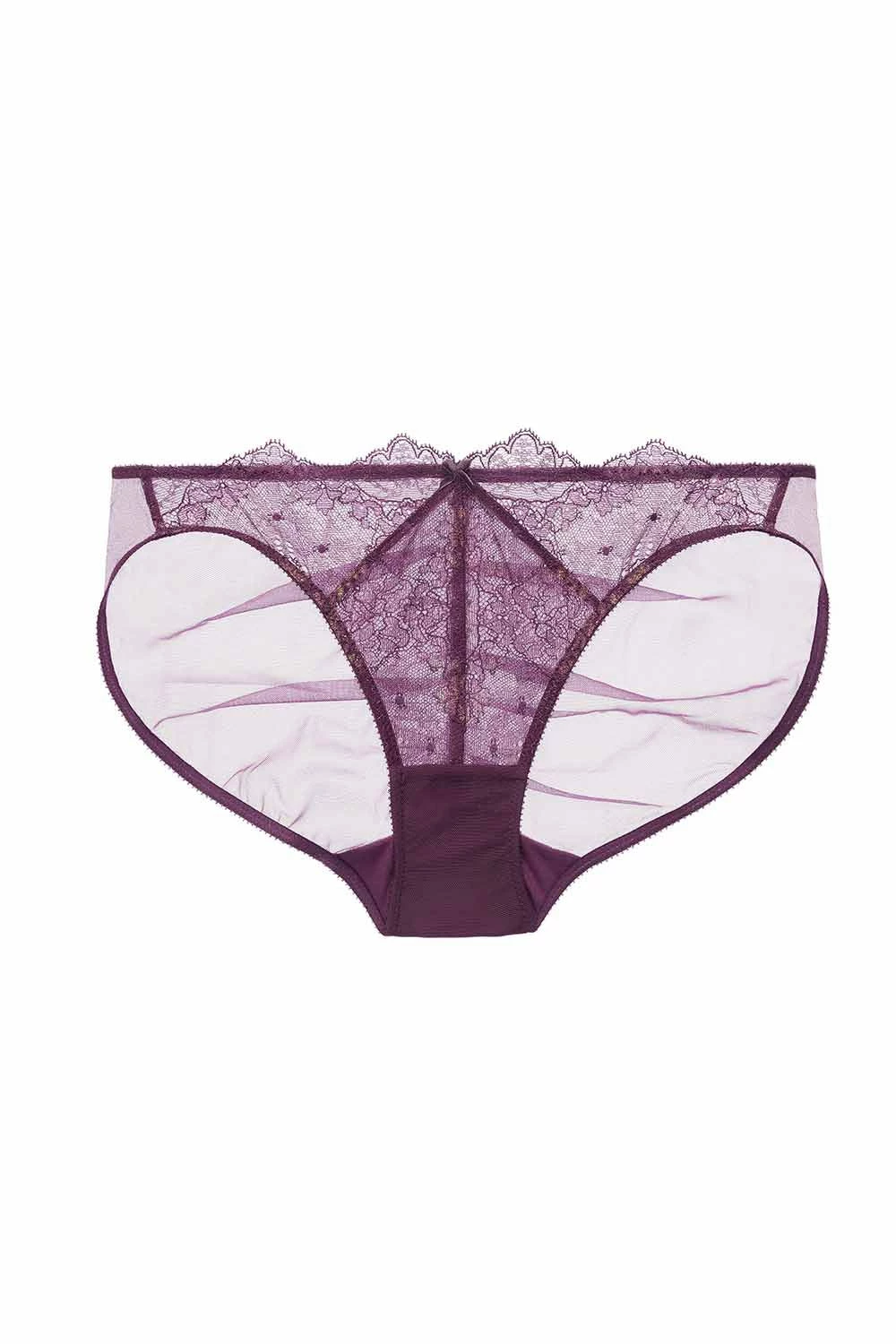 The Lurex Lace Bikini is a beautiful delicate lingerie piece made from fine Leavers lace with a candescent lurex colour. Full lace front with a sheer mesh back. Velvet and crystal trim detail.