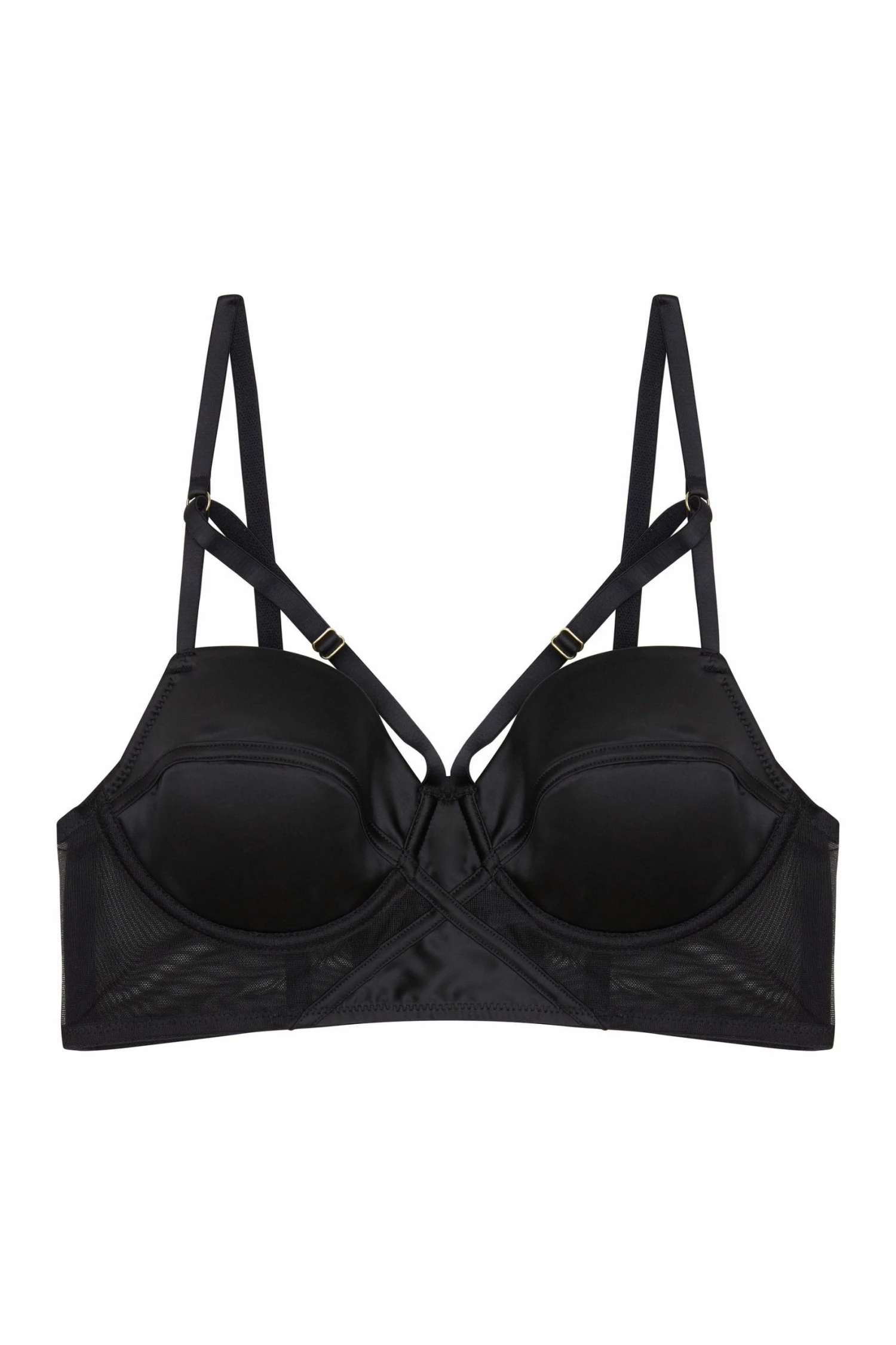 Become an unstoppable force of nature in the black crossover longline bra. A mixture of mesh and satin provides a cradle style never before seen. Underwired, padded cups and side boning give a support like no other, relish in empowerment at its maximum!