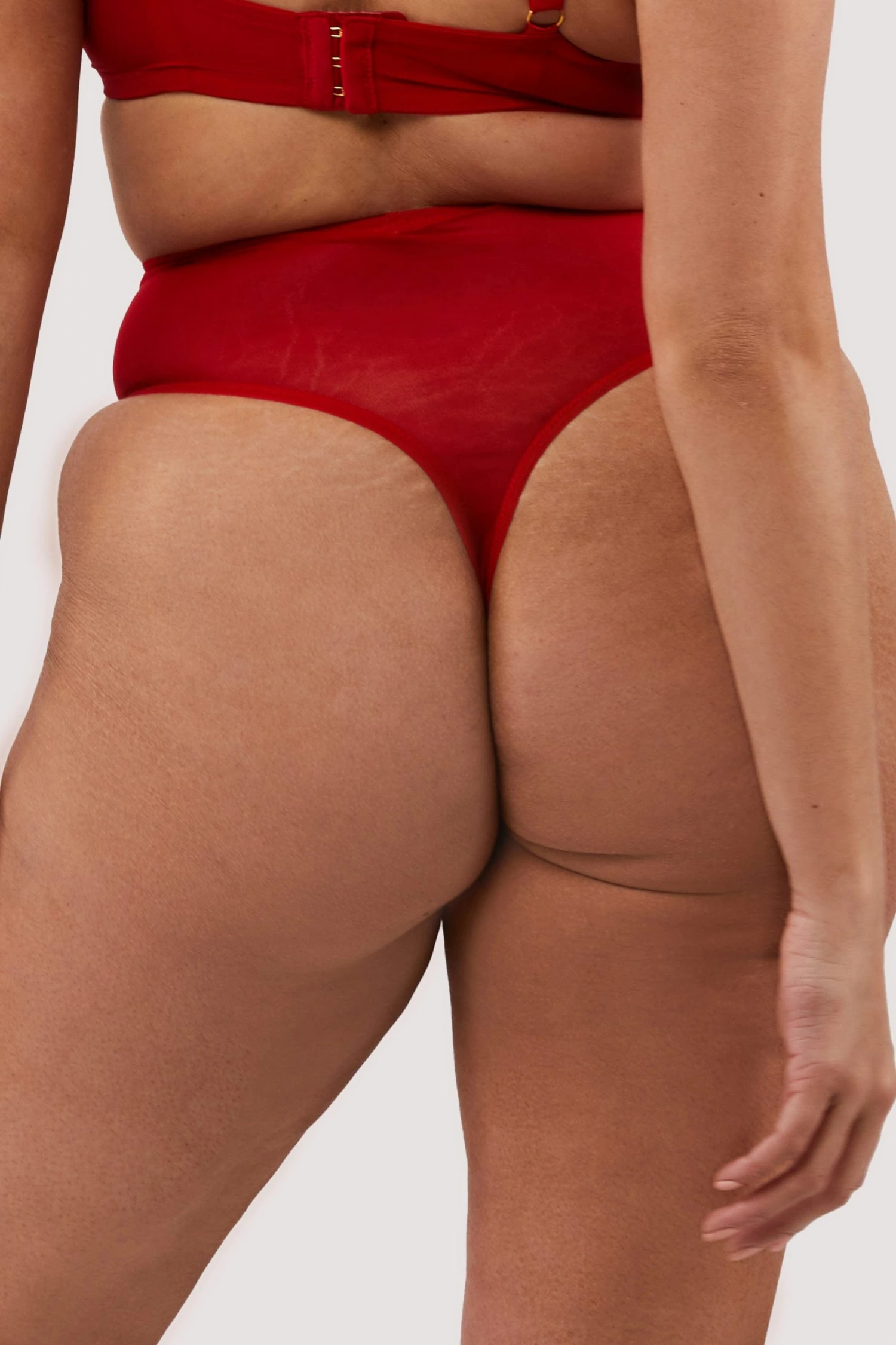 Hustler Lingerie X Playful Promises is an exciting new line of provocative and seductive lingerie for women who aren’t afraid to flaunt their sexuality. Maxine is fulfilling your S&M fantasy! This PVC set is molded to show off your body. The High waisted brief is features a PVC front and red mesh back.
