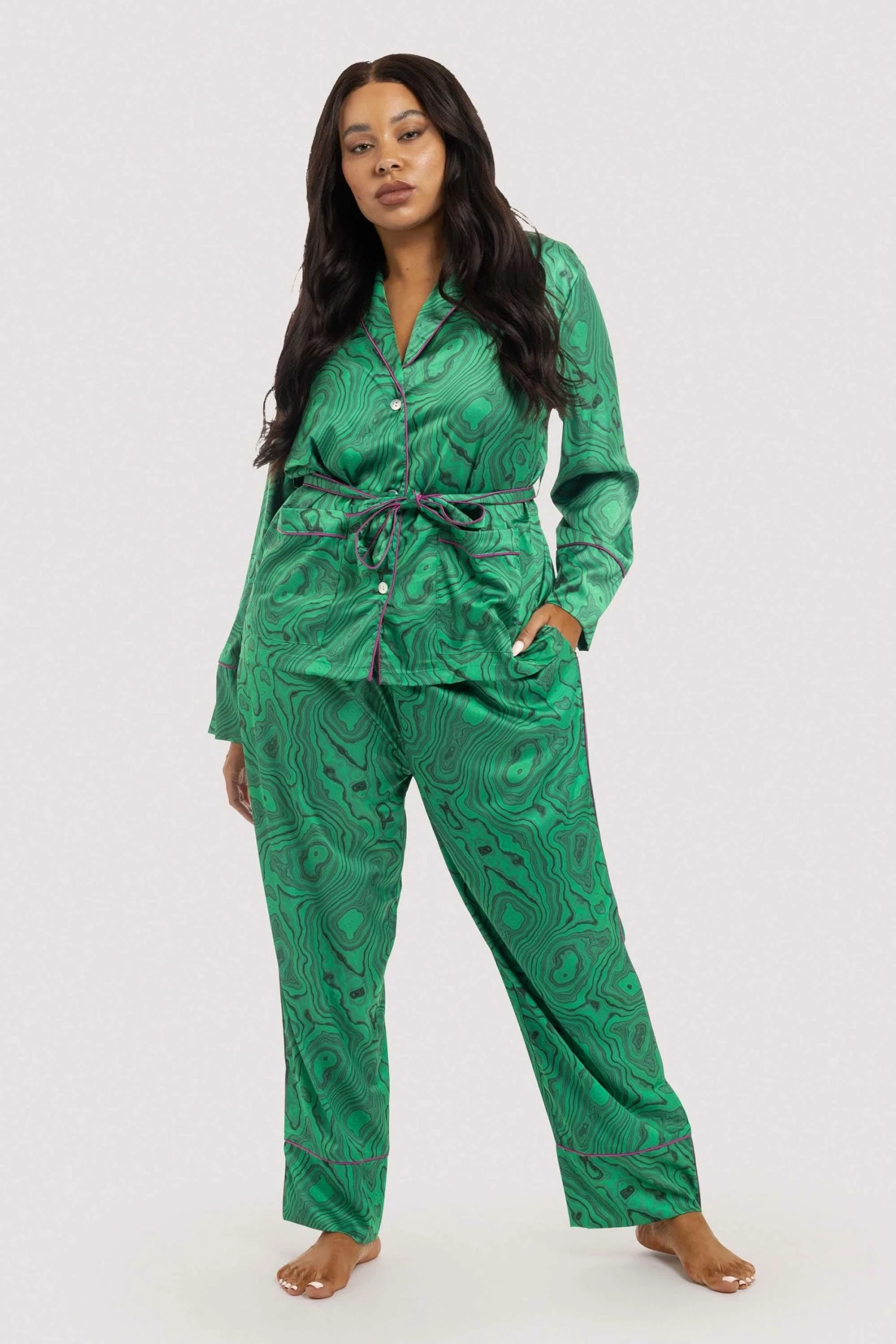 The Wrap PJ set. Made with the same tried and true pants from our classic set, but paired with a wrap jacket that can be worn in or out. Hello Versatility! Contrast piping, Self belted tie. Buttons at front opening. Shawl collar. Pockets on top and pants. Digitally printed and eco friendly with a stunning emerald green Malachite print with a pop of orchid piping.