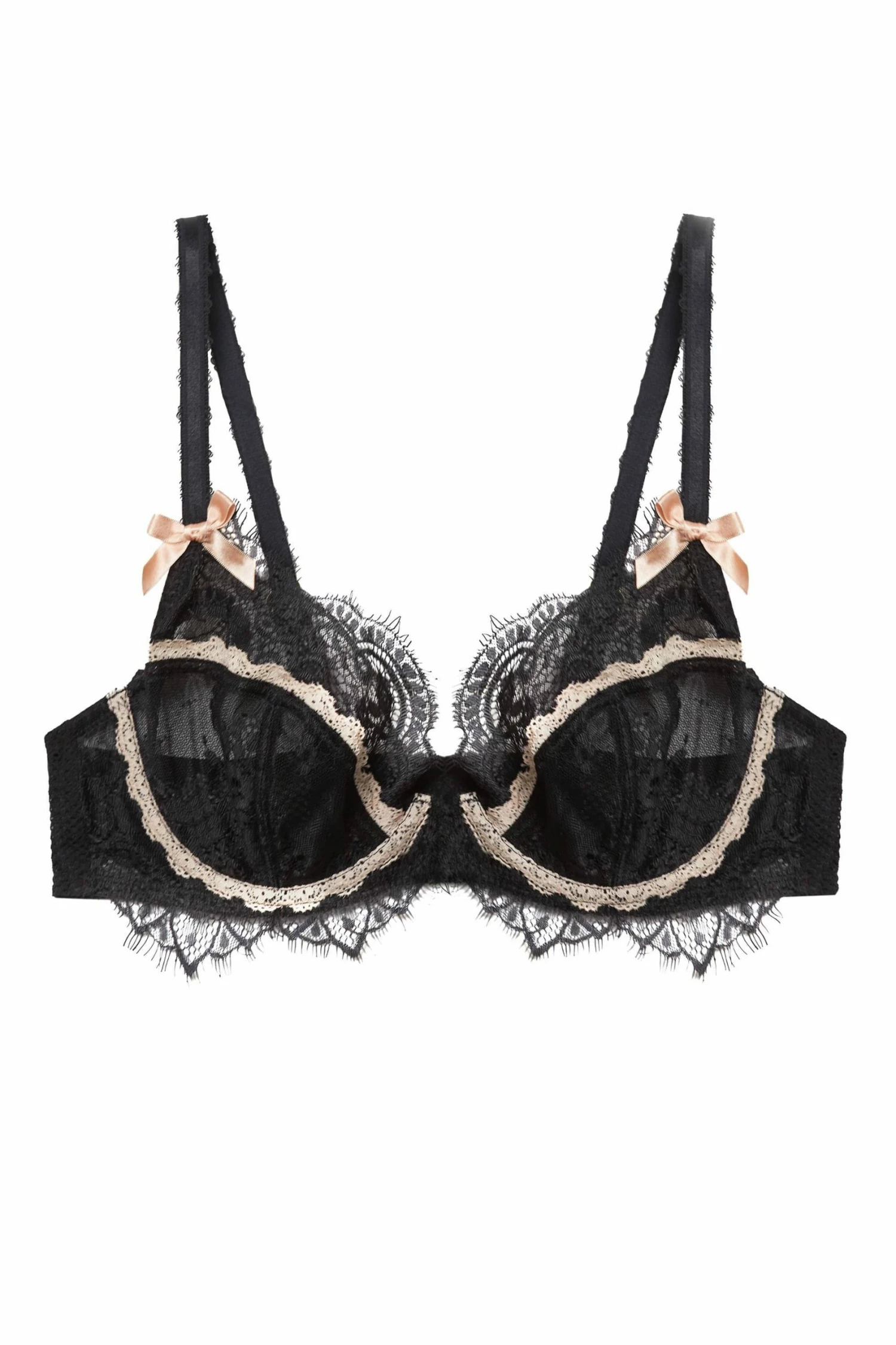 Feel glam in the Caresse Black Lace Bra. With intricate black lace cups, baby pink lace accents and satin bows this is the perfect bra to add to your bra collection. Pair with our matching Suspender and Brief for the full look