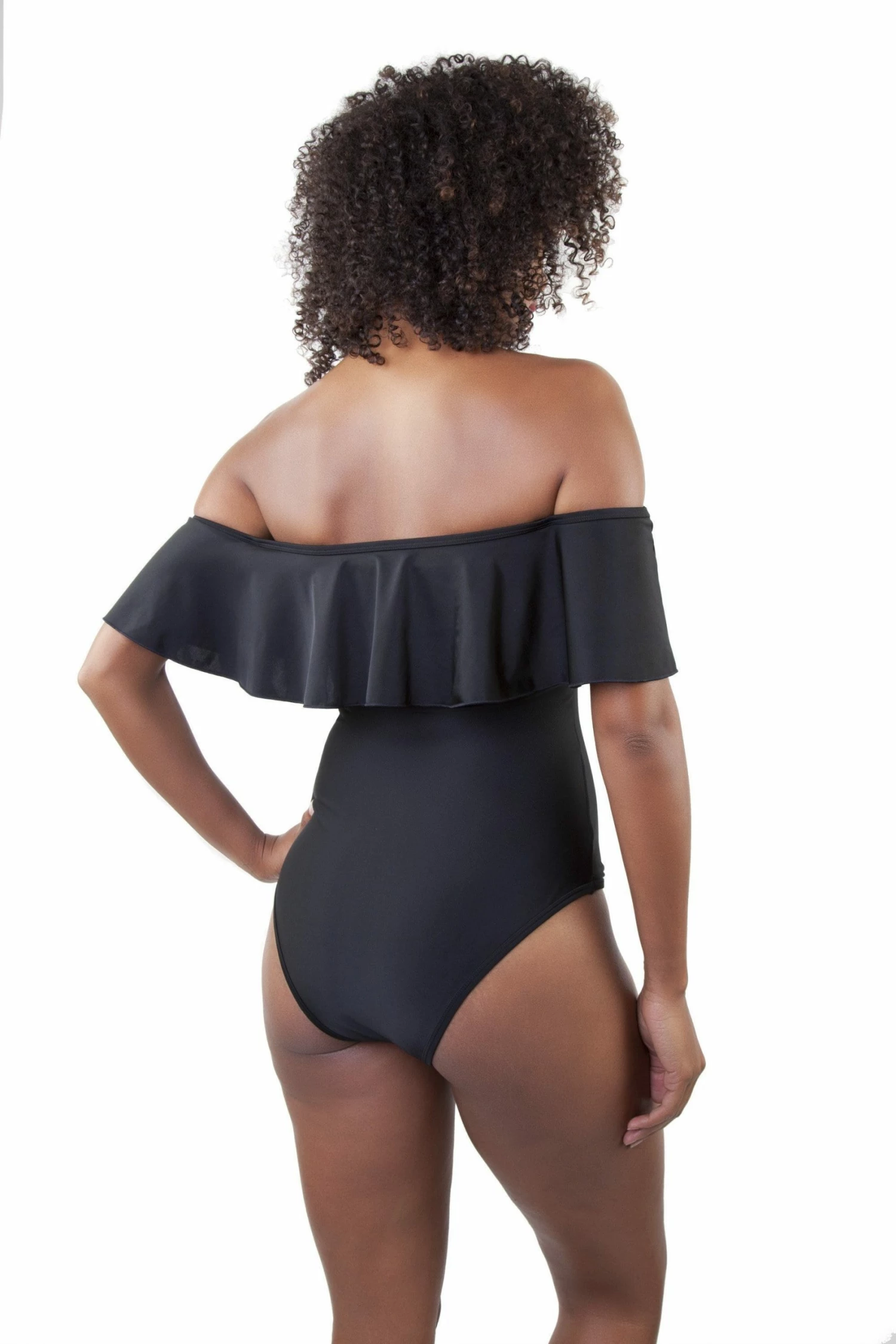 This simple swimsuit will get all eyes on you at the poolside! Show off your shoulders with it’s frilled bardot neckline, adding volume to your bust and a flattering brief-cut on the bottom.