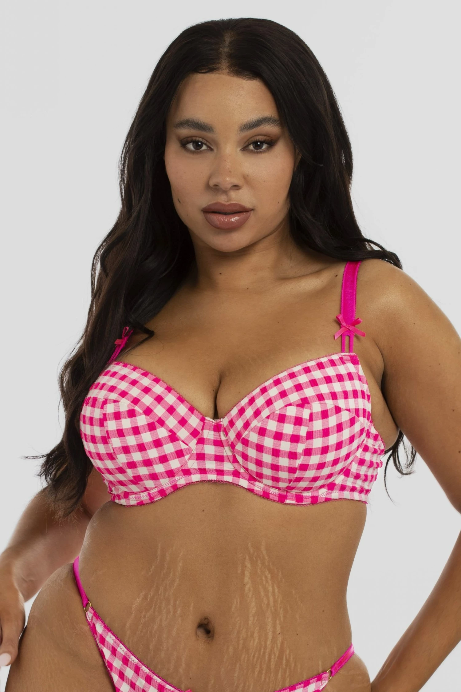 Feel flirty in our Daisy Gingham Bra….Hot pink and white gingham patterned cups finished with pink adjustable straps and pink satin bows. Match with our Daisy Thong or Brief for the ultimate flirty finish.