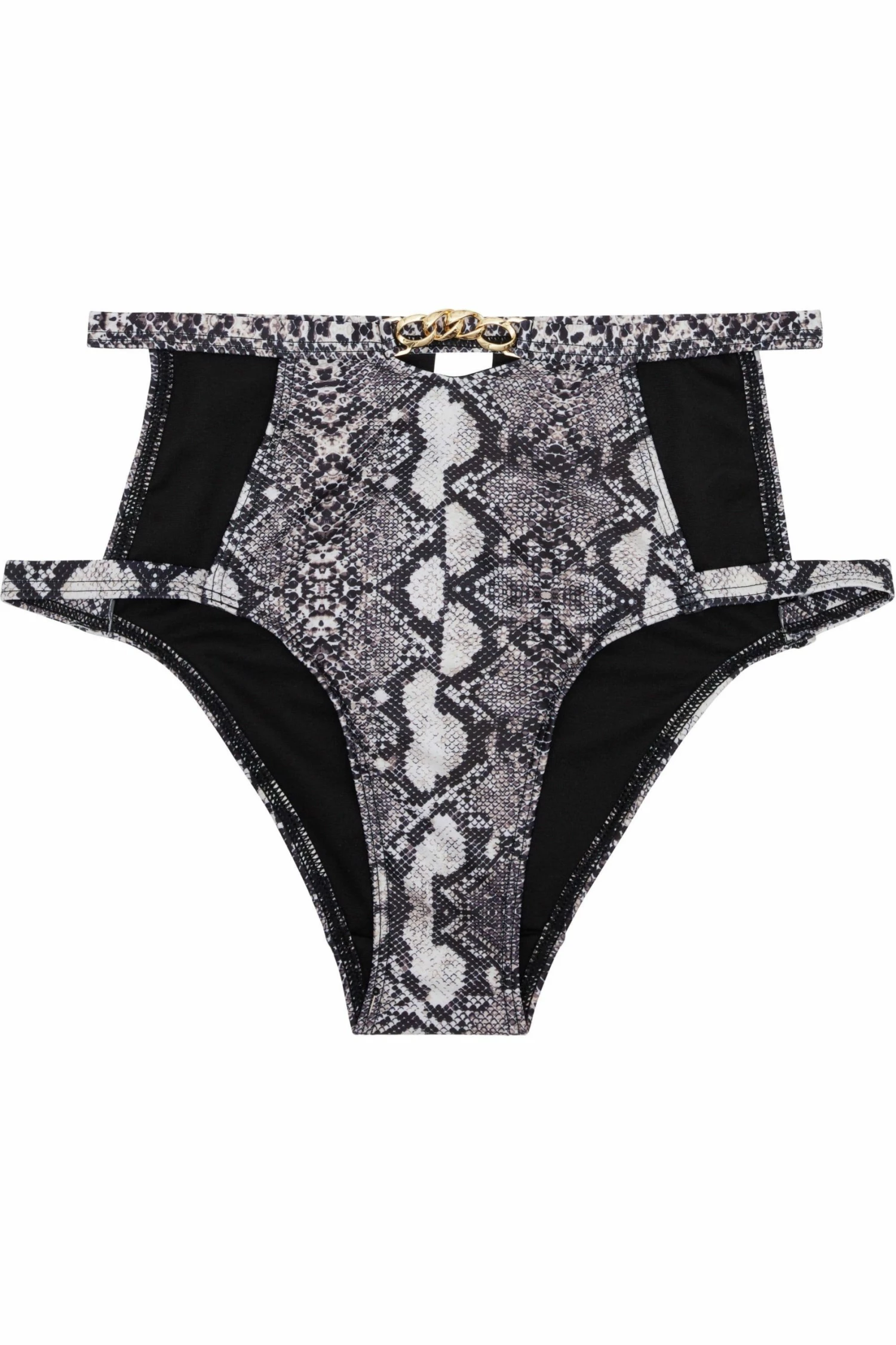 Ssss seriously cool. This fun snake print chain high waist brief is a must have. The chain detailing along the waist band, and the cut-out details at the waist bands are key features and make this style effortlessly cool. Pair with the matching snake print range.