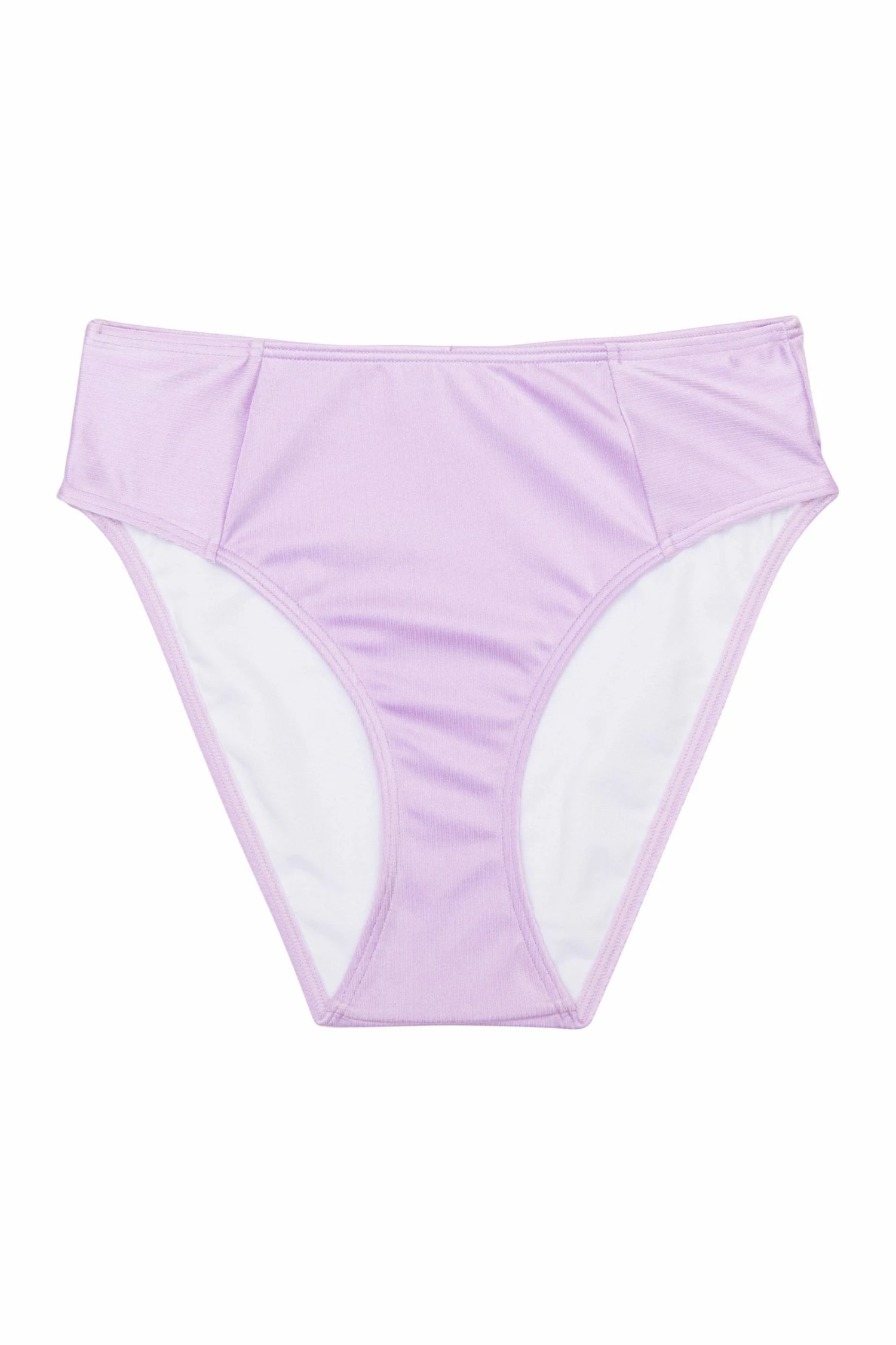 High shine, in our pearlescent lilac fabric. In a simple high waist bikini style, match with the high shine triangle bikini top