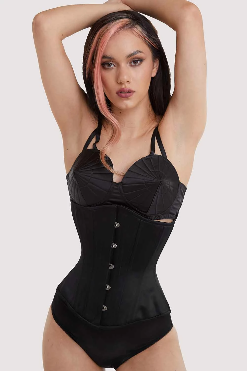 Create the perfect John Willie illustration-inspired silhouette in the Bettie Page Satin Underbust corset! The corset is comprised of soft black satin, with a steel busk opening at the front and lace-up with strong black lacing strings at the back. The corset is steel boned and in an underbust style, so you can wear it with your favourite Playful Promises bras. A modesty panel – which is removable – is included, and the corset is lined with 100% cotton for your comfort. The inside of the corset features waist tape to help cinch you in.