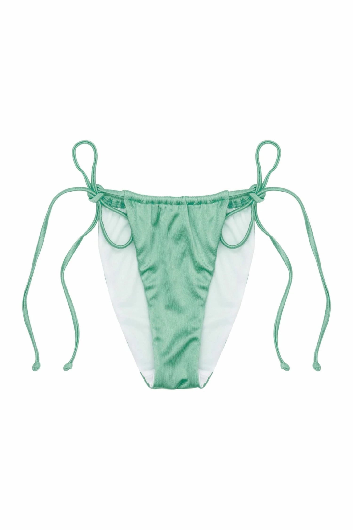 High shine, in our pearlescent mint green fabric. Soft to touch and perfect for Summer. In a simple bikini brief style, the front and back panels attached by a thin strap that ties at each side of the waist.