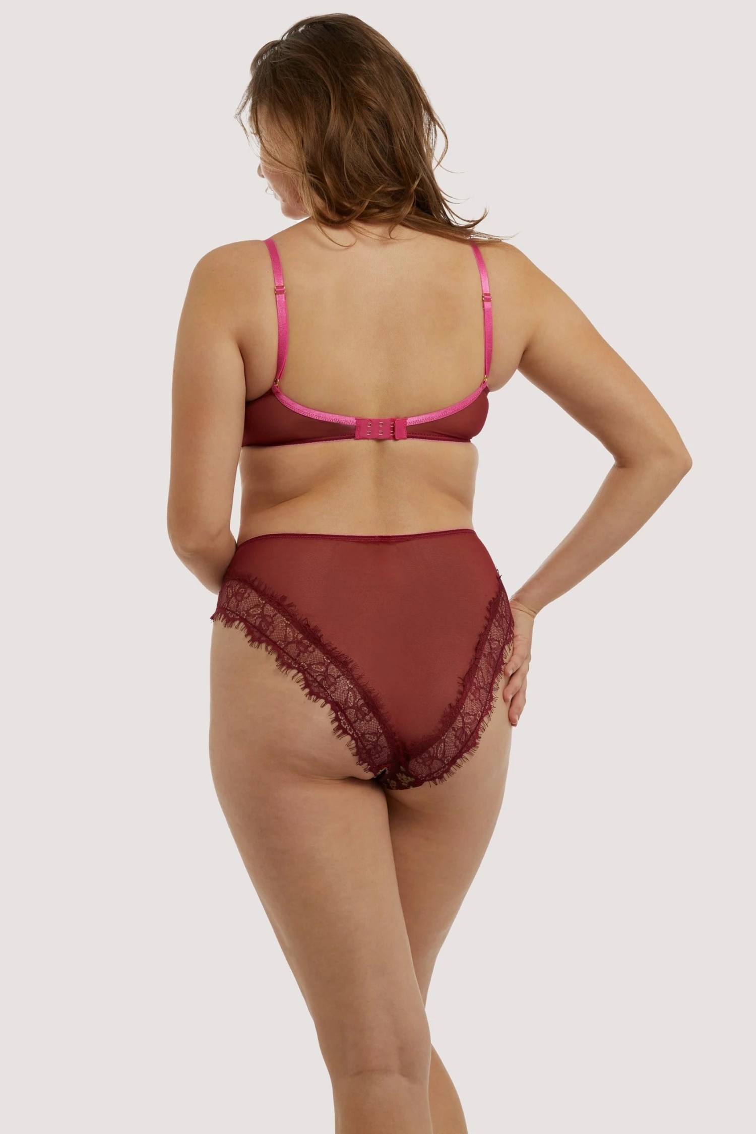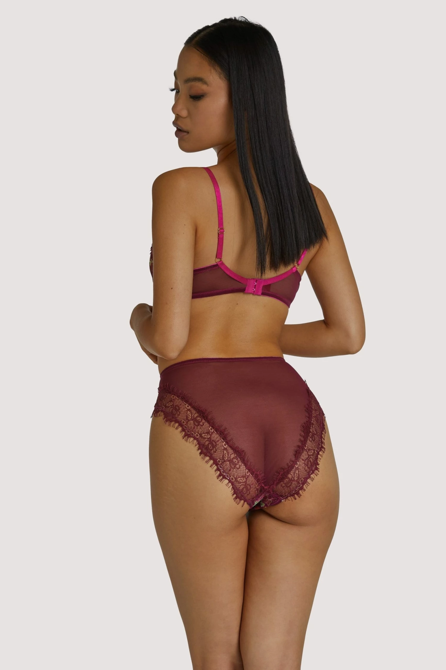 Our Neve Kimono Plunge Bra has accents of pink to make them wink…Featuring burgundy floral mesh cups with a luxurious lace overlay with hot pink edging and straps, this is the perfect bra for you. Pair with the Neve High Waisted Brief for the complete set.