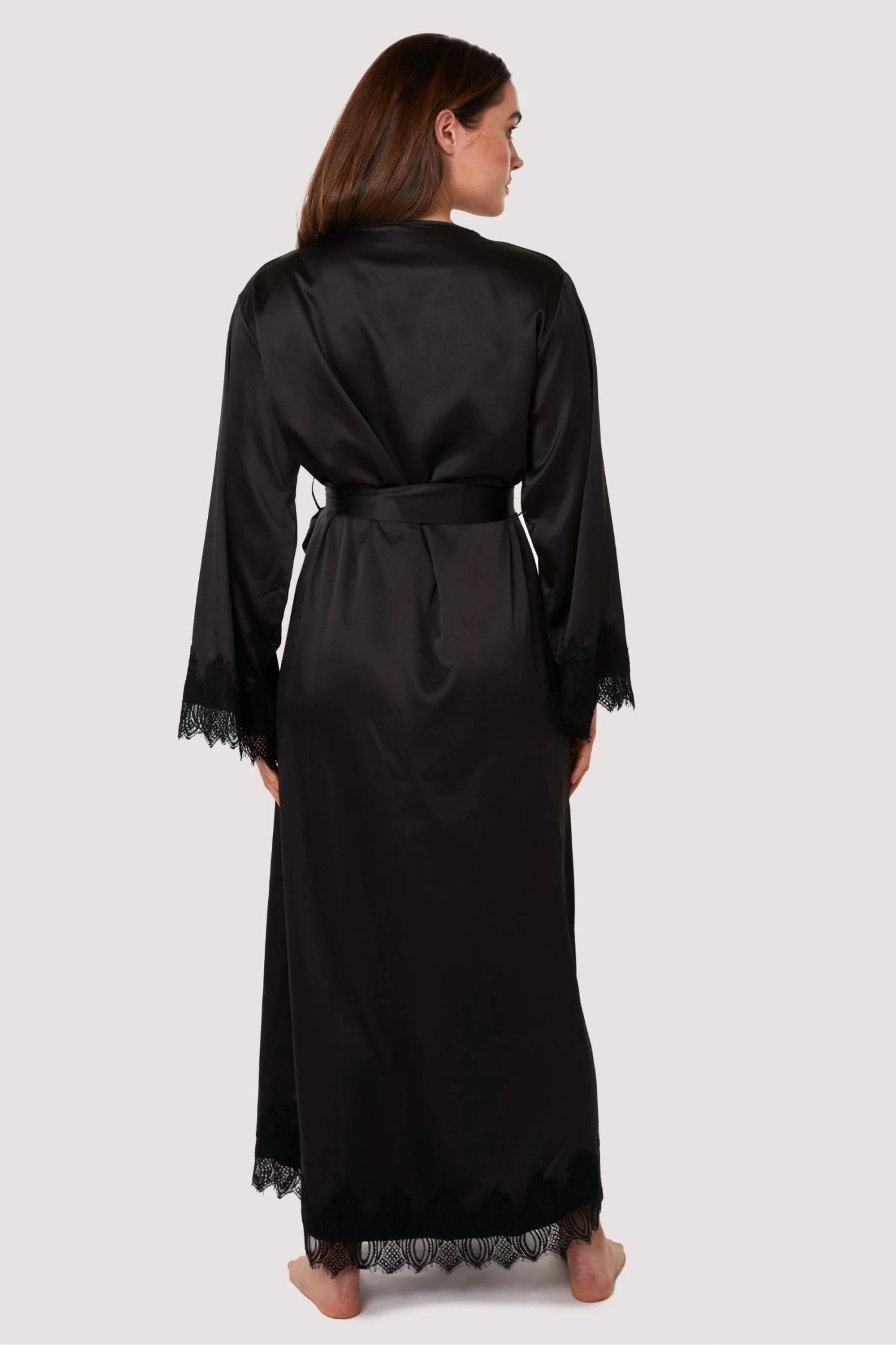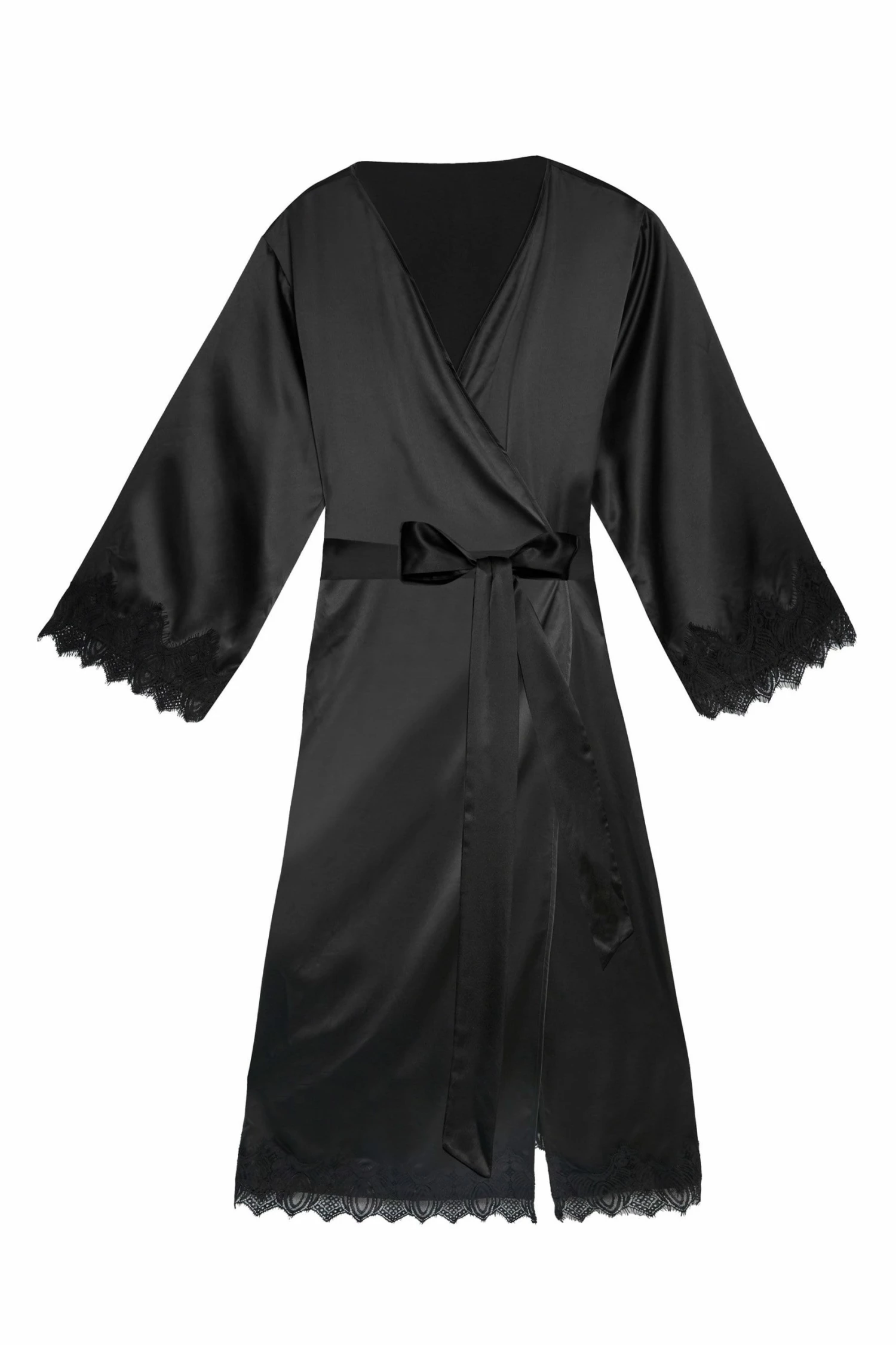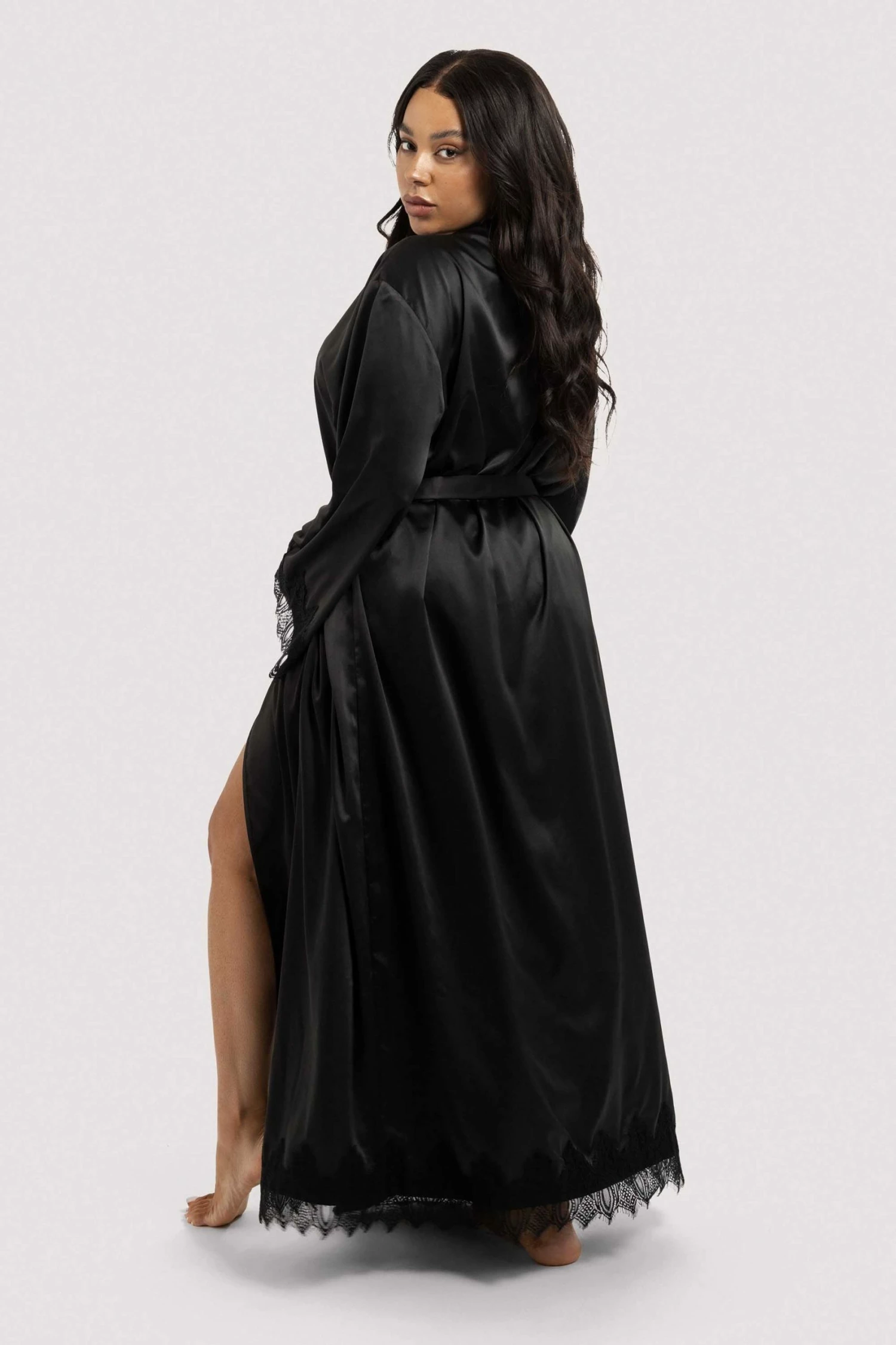 The perfect robe to throw over your favourite lingerie set. Our Black Applique Lace and Satin Robe is super luxurious, made from silky soft black satin with lace trim on the sleeves and hem and finished with a satin tie around waist to cinch you in.