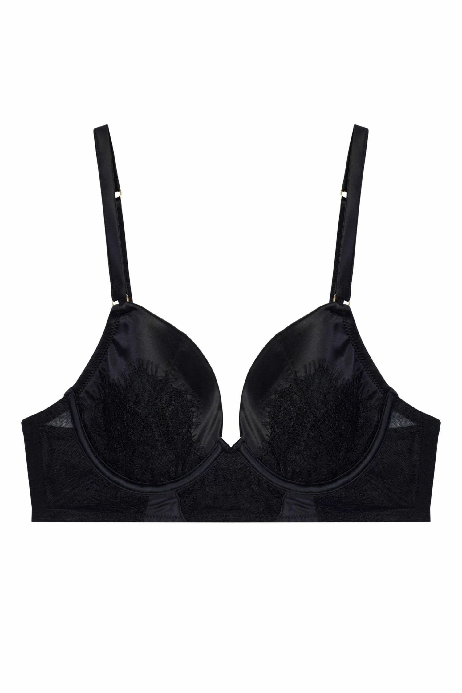 Ooh-la-la! The Melina set is back and this time in midnight black. The cups are molded to enhance your bust, with a satin underlay and eyelash lace over the top. This set is perfect for slipping under a slinky dress!