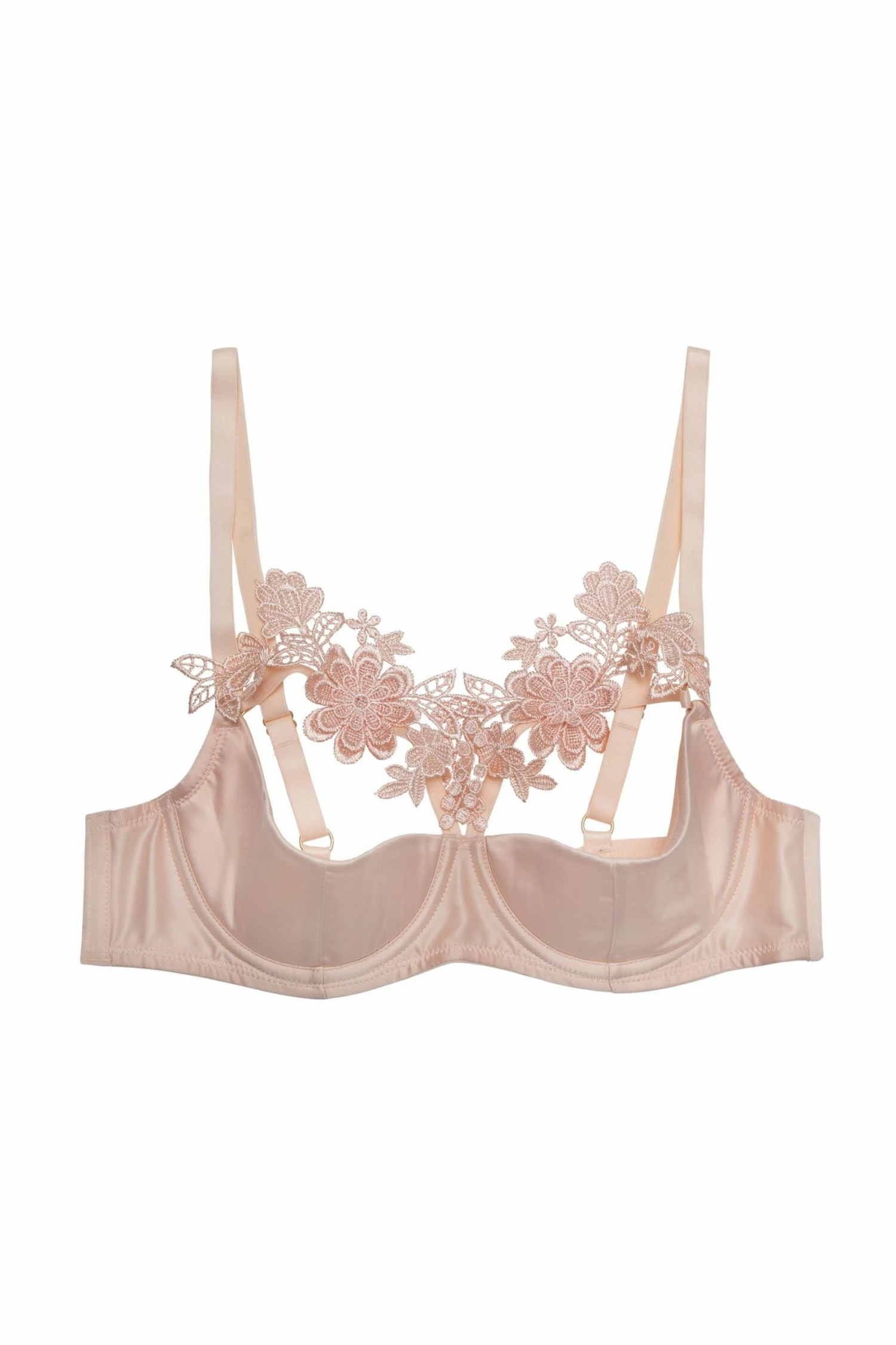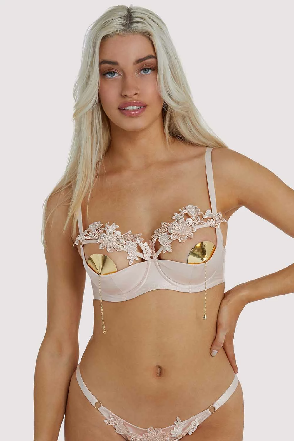 Exude elegant sensuality in the Guipure Quarter Cup. Peach satin encases the quarter cup, with applique lace harness strapping framing the chest. The bra looks gorgeous with or without pasties!