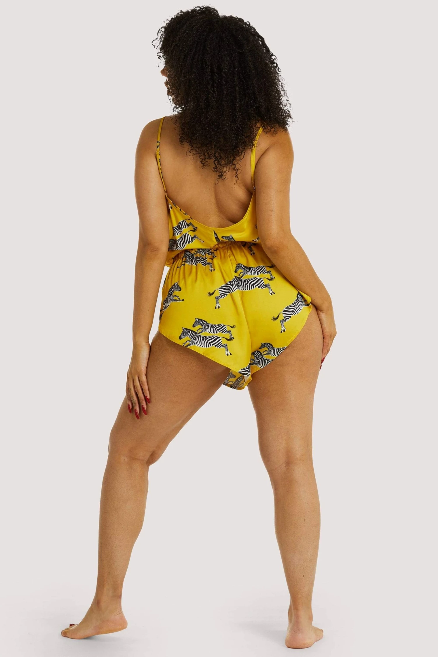 This sleep playsuit has a retro-inspired silhouette with a cheeky fit and a drawstring tie to cinch in at the natural waist. Cowl neck detail and adjustable straps with gold hardware. Digitally printed