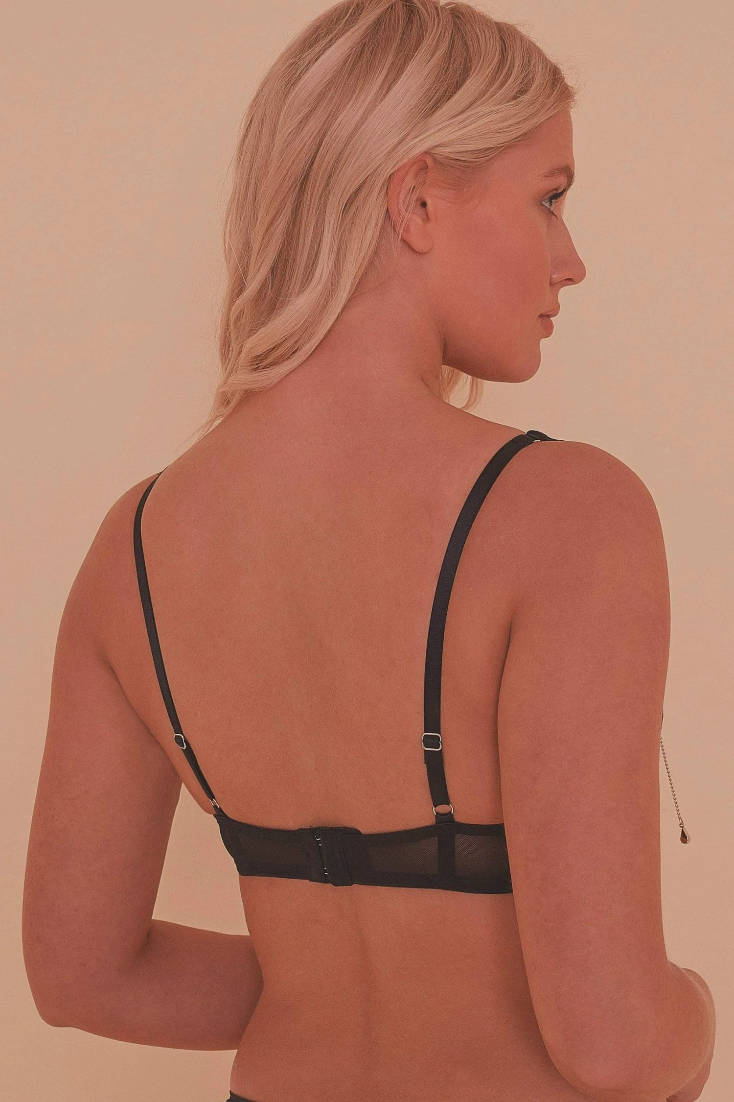Stunning and seductive, Ava has bondage style strappy detailing across the bra. The รยผ cups have adjustable harness detailing across the top of each cup. Three strap details sit at the side, and a padded satin detailing sits underneath the arm strap. This is a must have for the season.