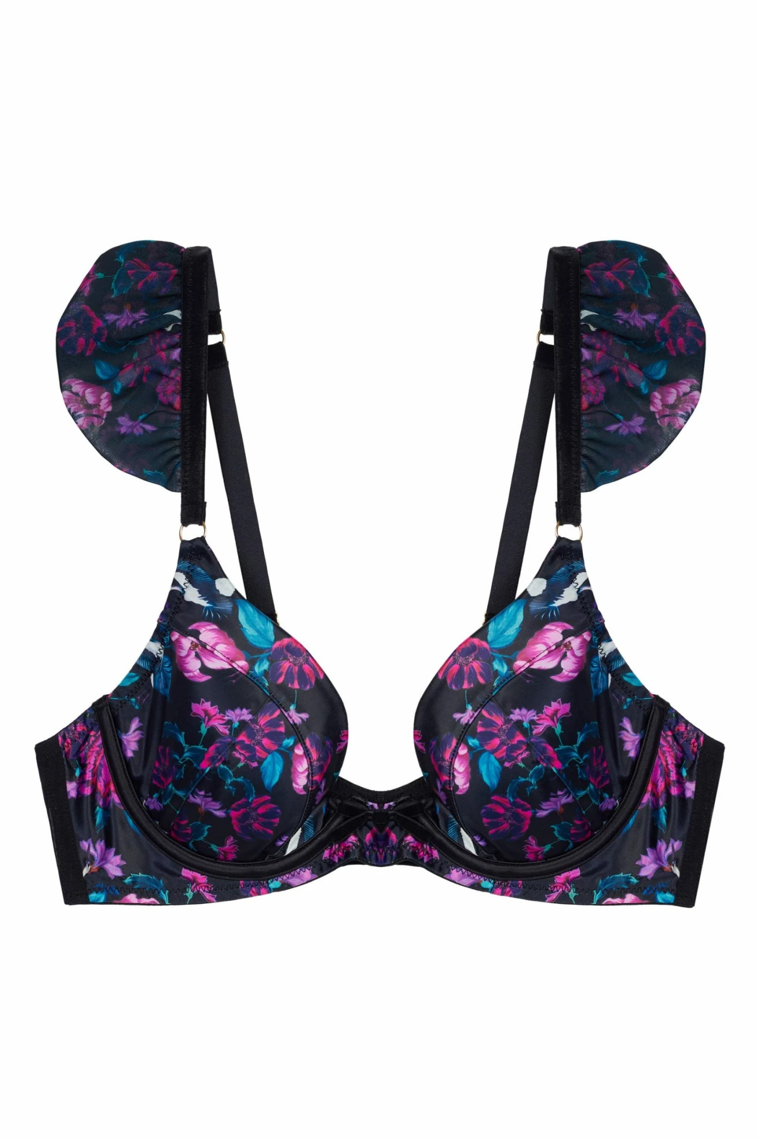 Make a stunning entrance in the Noriko. Featuring a floral and crane print in vivid colors on a contrast black base. Pair with the matching brief and suspender to complete the look.