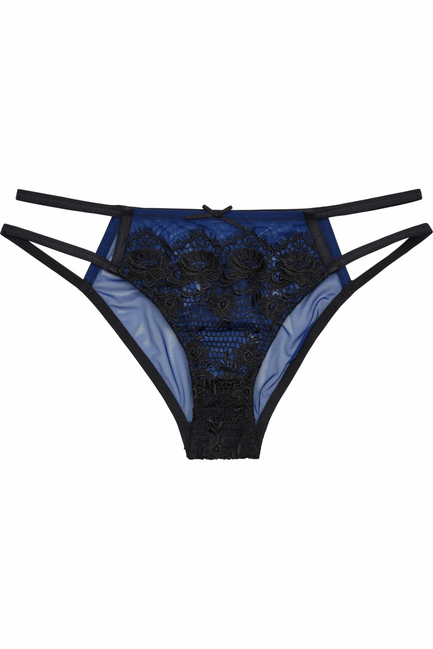 Bewitch in Tabitha. This core style features royal blue mesh panels adorned with soft applique lace and elasticated strappy waist bands. Creating a cheeky opening at either side, these briefs are perfect to pair with the Tabitha core bra.